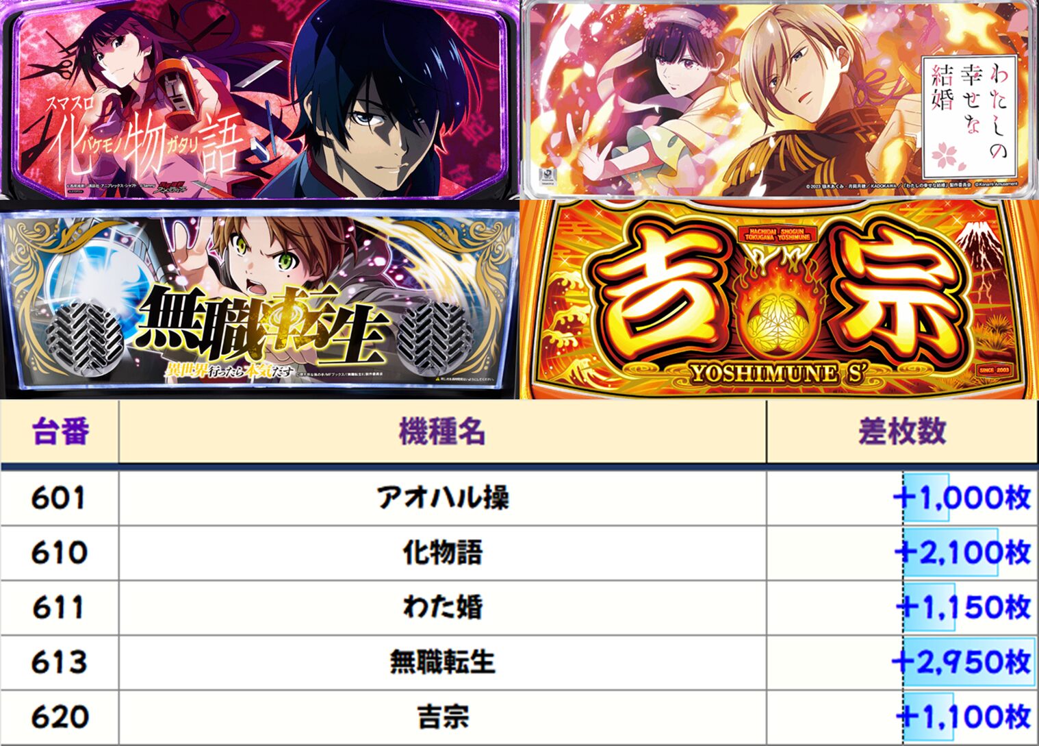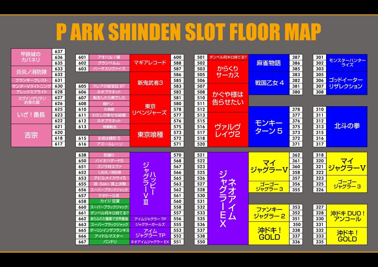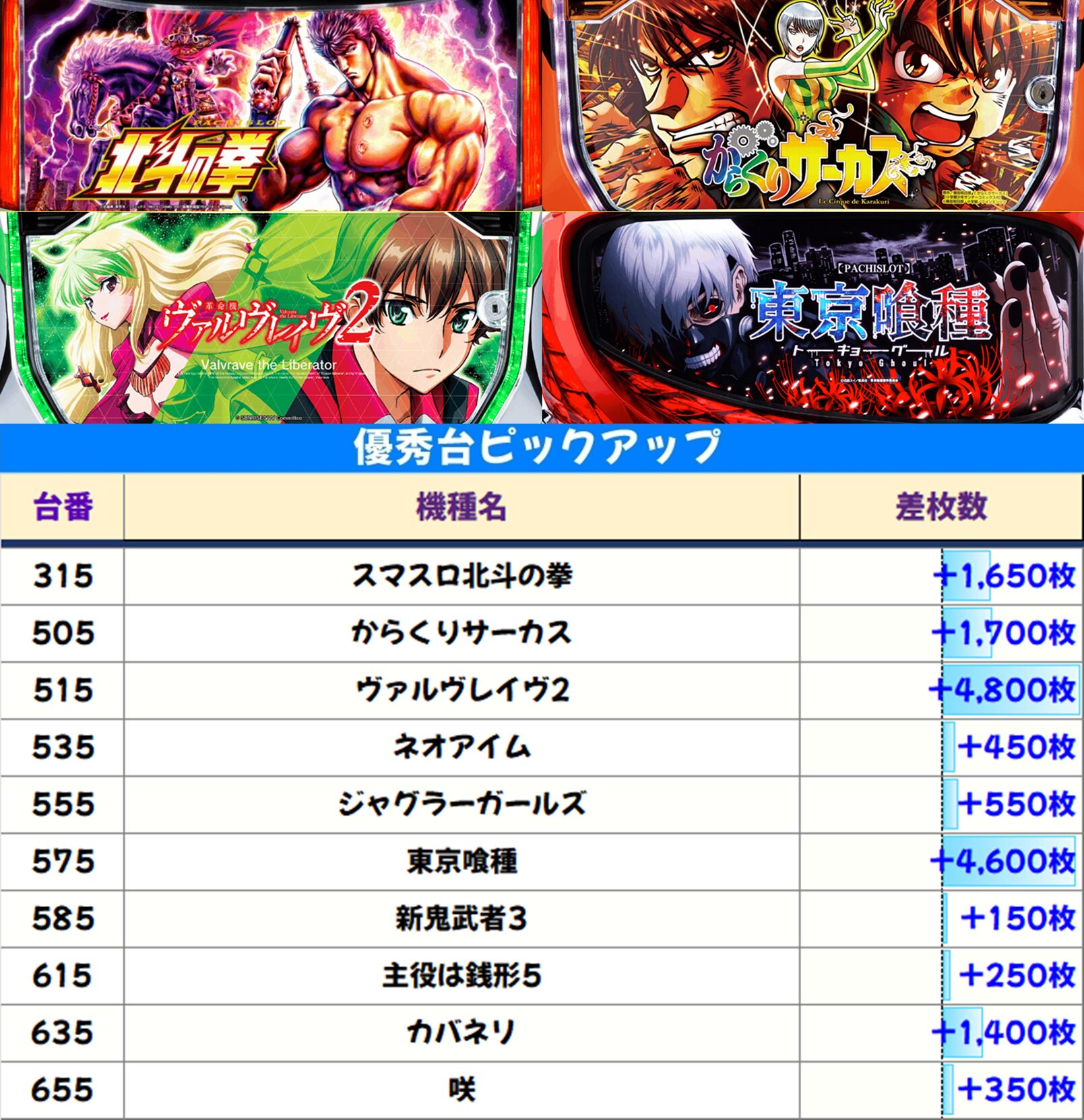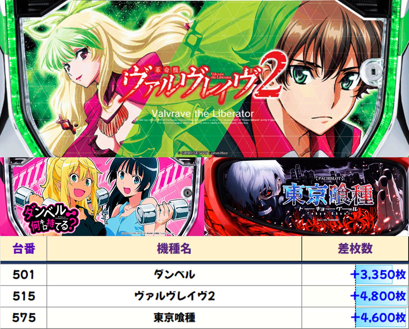 本日は【新鬼武者3】【からくりサーカス】の2機種が高配分。【ヴァルヴレイヴ2】【東京喰種】の単品から大爆発台も出現! 5のつく日は赤コーナー! 覚えておいて損はないですよ。