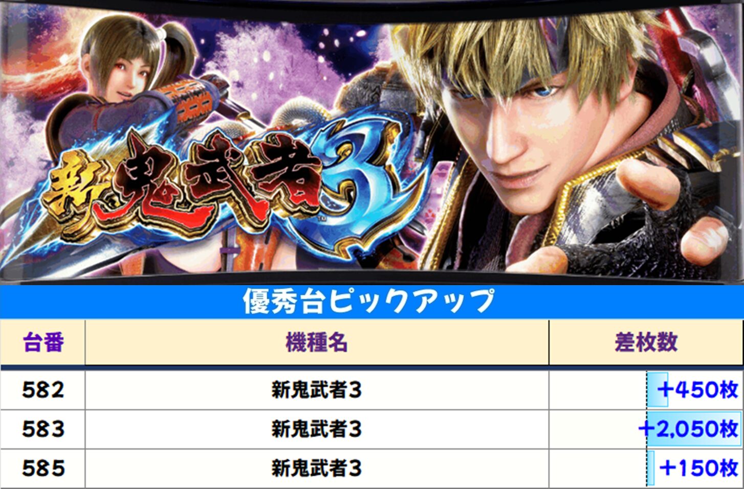 高配分:新鬼武者3(3/4台+) 平均+650枚