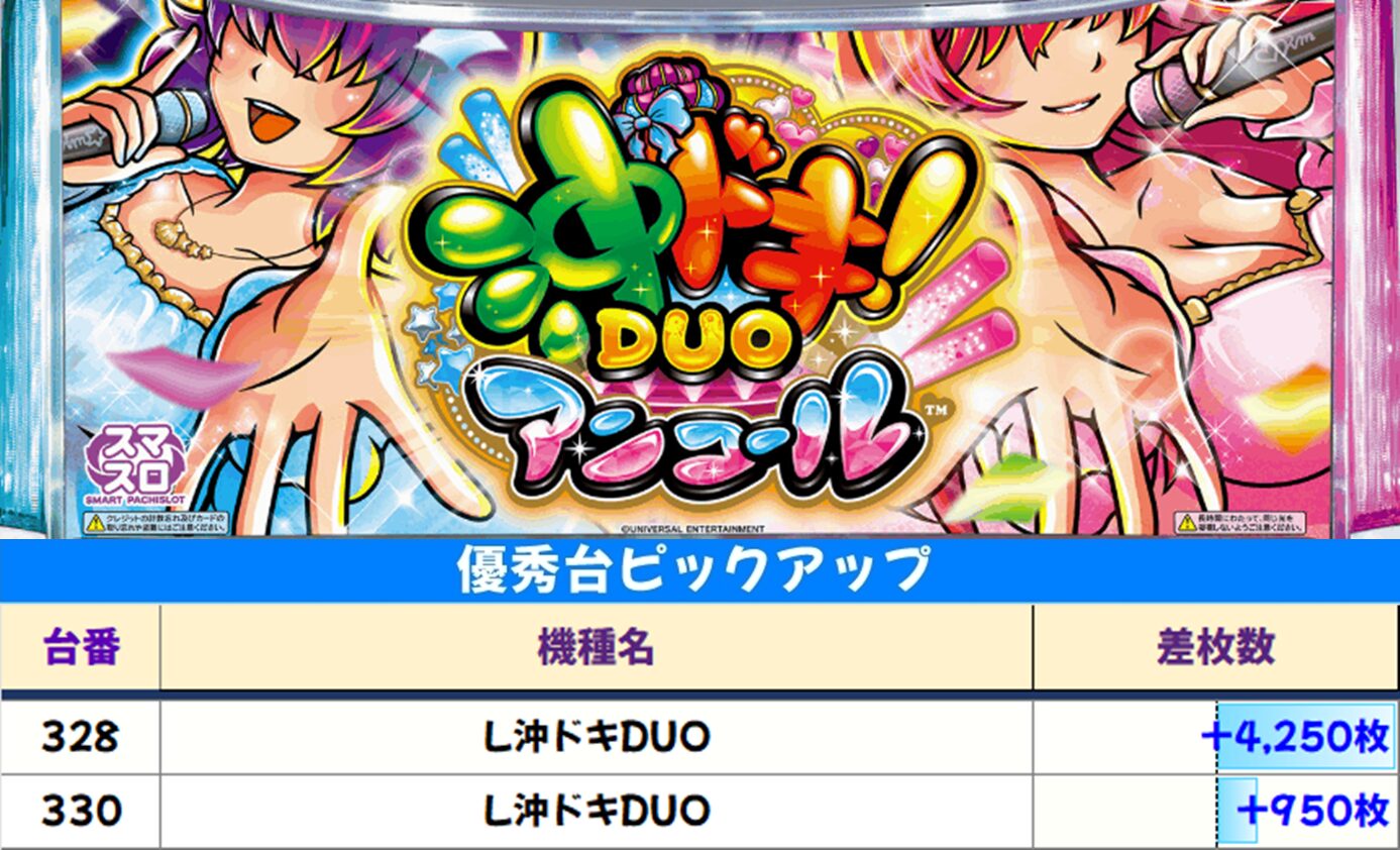 黄色コーナーの【L沖ドキDUO】も高配分。328番台が4,000枚を超える出玉を獲得して大勝利!