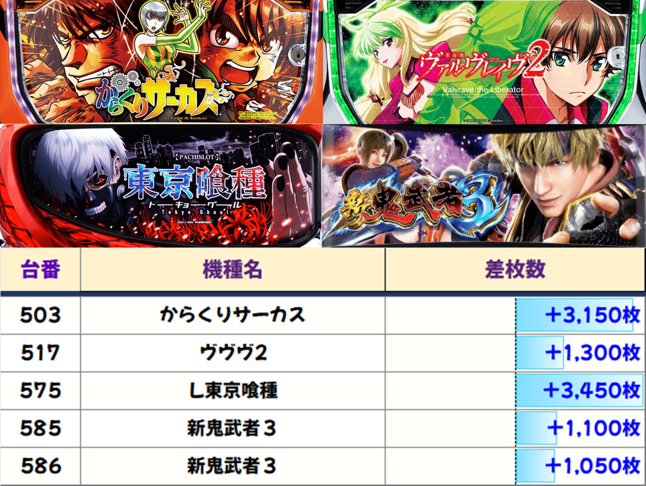 本日は【東京喰種】が高配分。4台中2台がプラスで+4,800枚の爆発台も出現! 【ヴァルヴレイヴ2】【マギレコ】にもお宝台がありました。