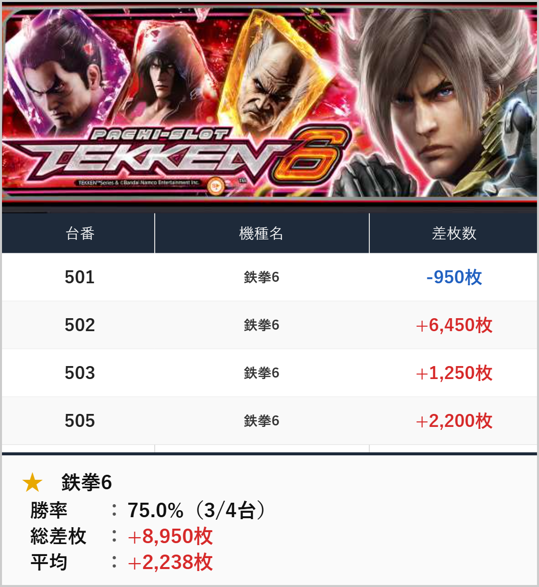 ピックアップ:鉄拳6(4台)【平均+2,238枚】