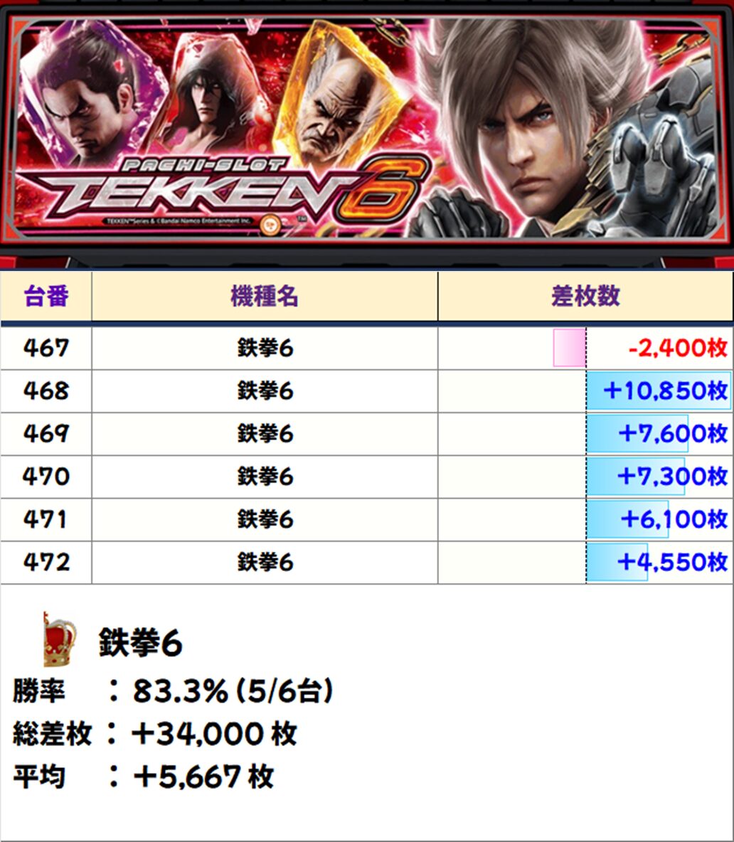 【6台並び②】鉄拳6(467-472番台)【平均+5,667枚】