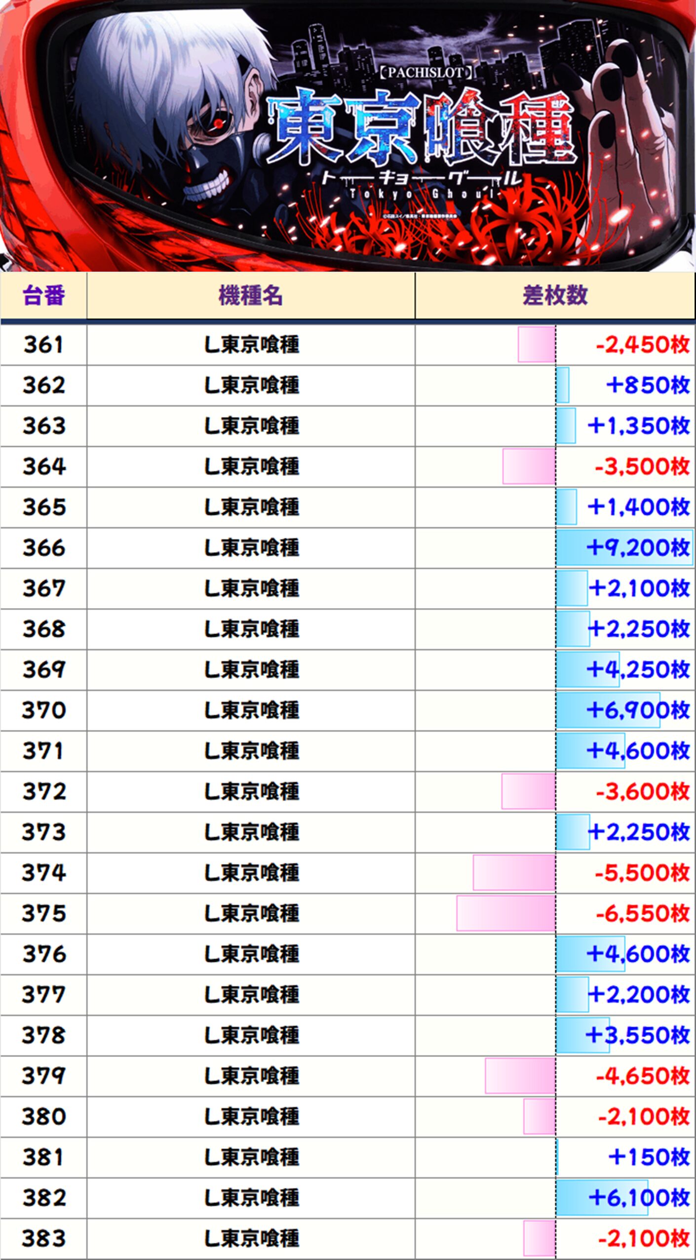 【6台並び①】東京喰種(366-371番台)【平均+4,883枚】