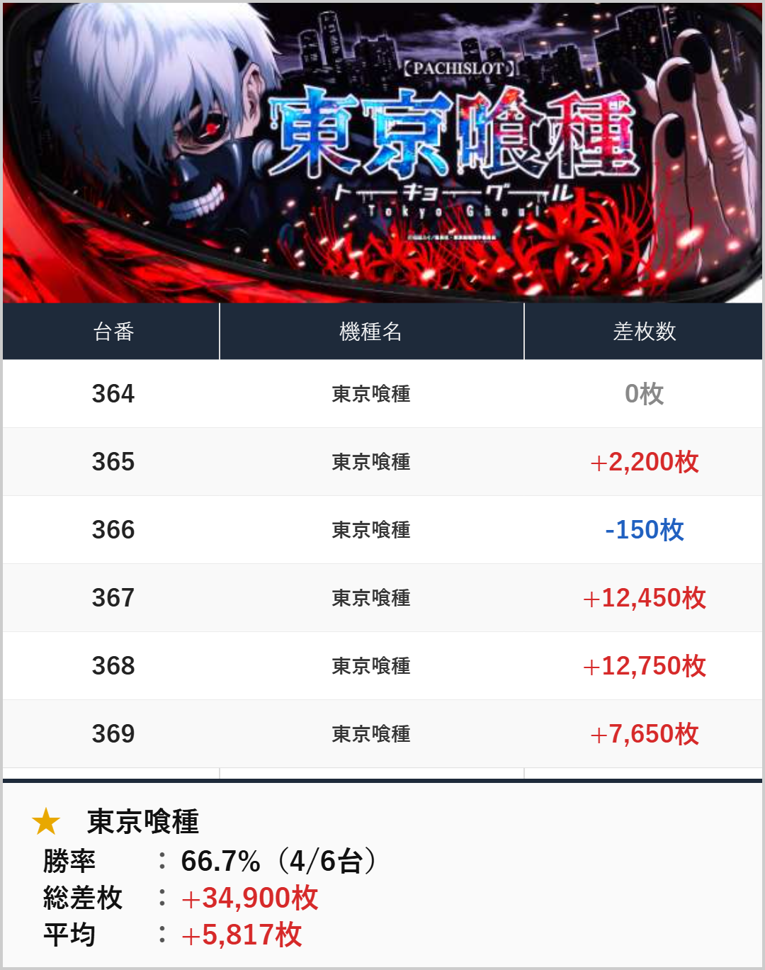 6台並び①:東京喰種(364-369番台)【平均+5,817枚】