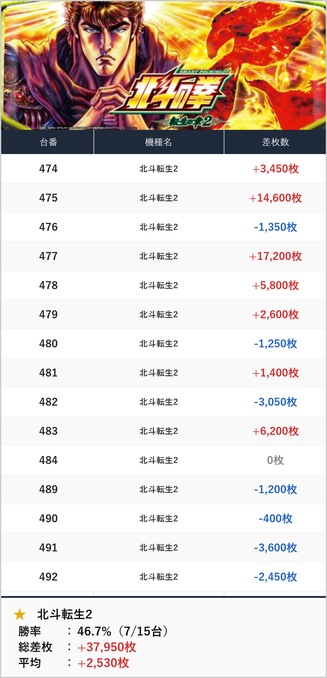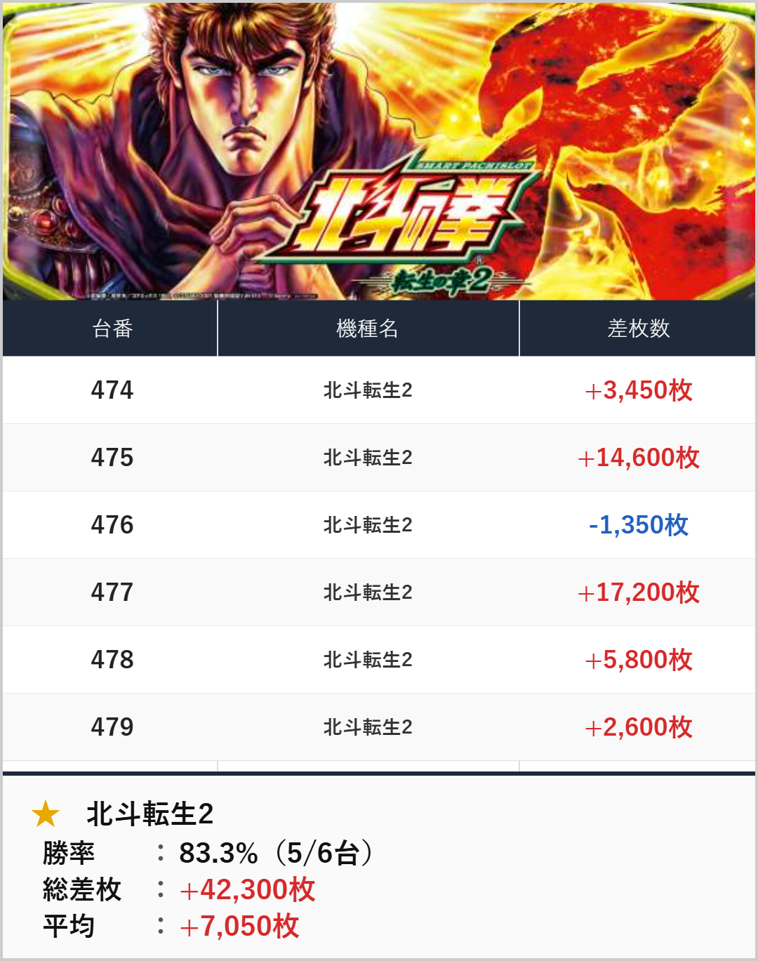 6台並び②:北斗転生2(474-479番台)【平均+7,050枚】