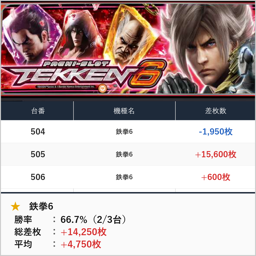 3台並び⑥:鉄拳6(504-506番台)【平均+4,750枚】
