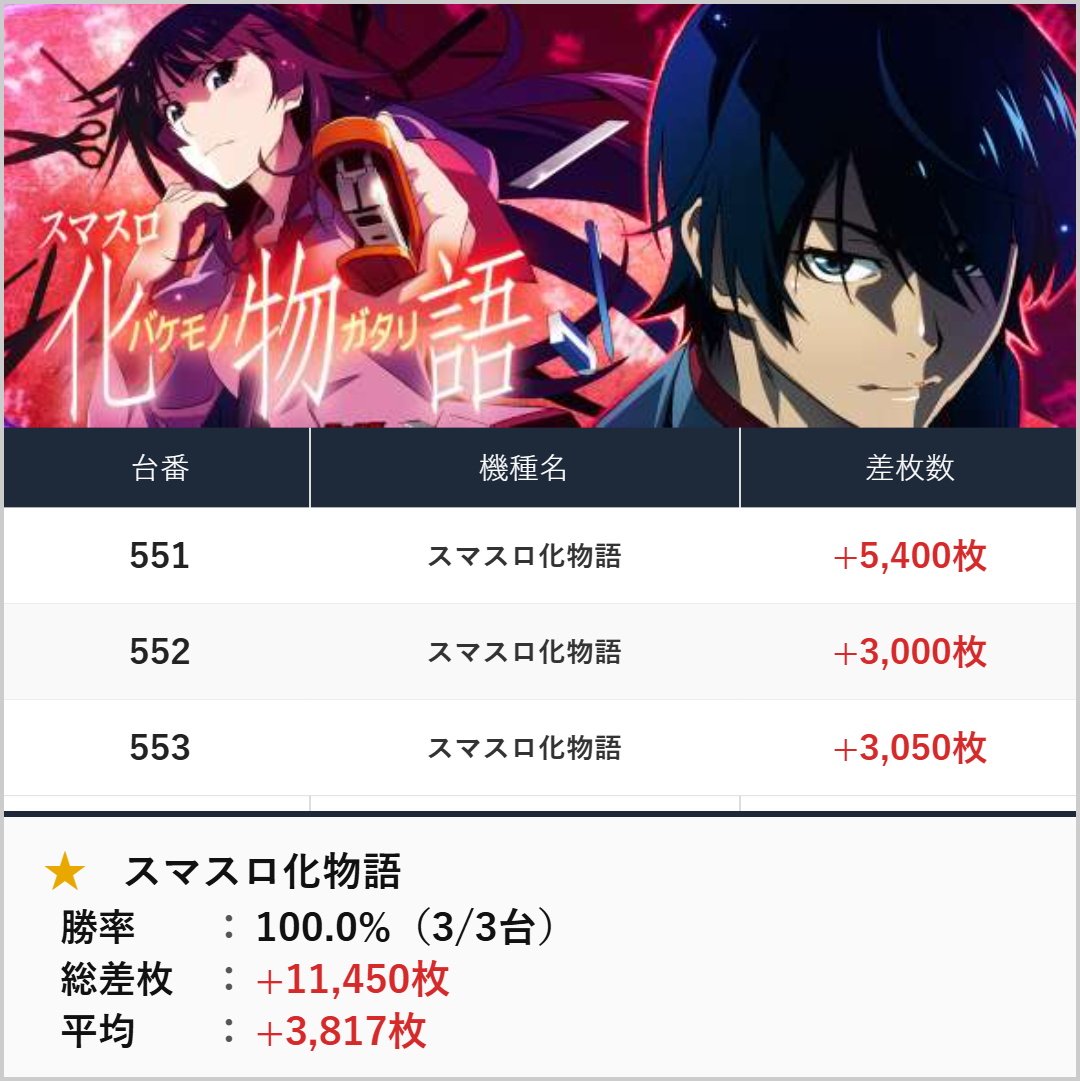 3台並び②:スマスロ化物語(551-553番台)【平均+3,817枚】
