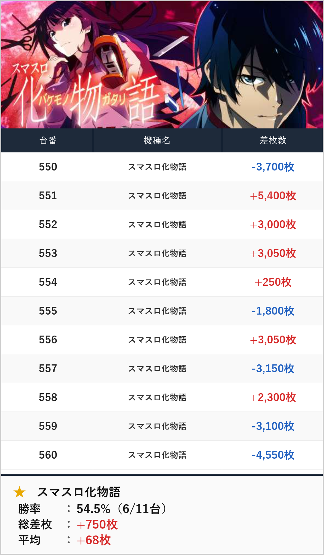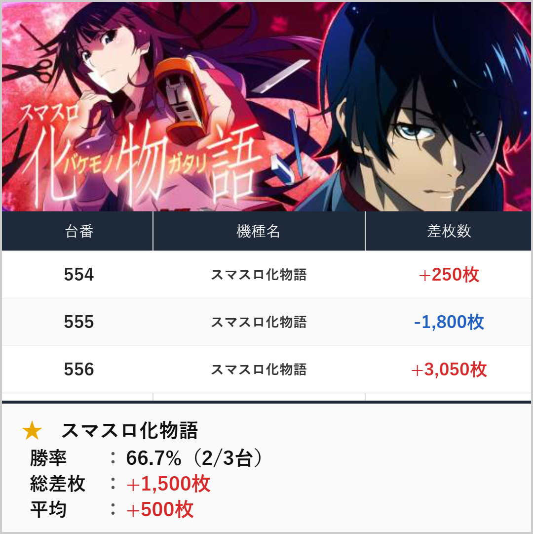 3台並び③:スマスロ化物語(554-556番台)【平均+500枚】