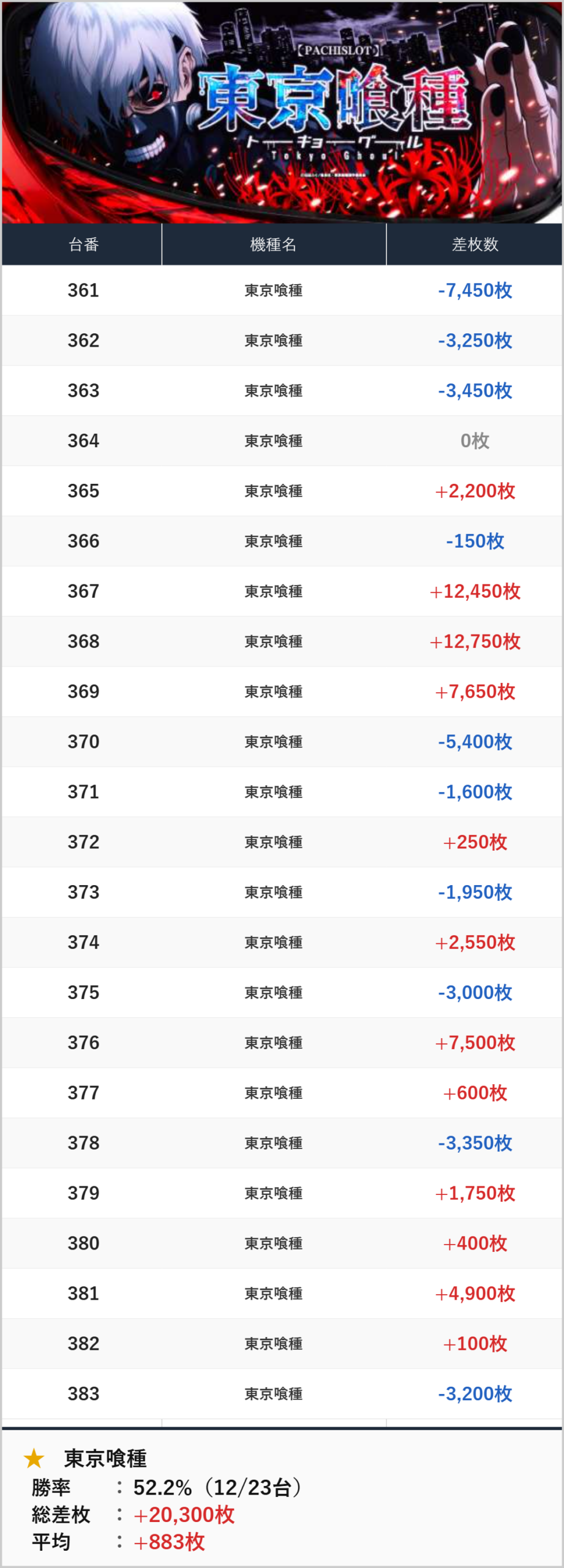3台並び④:東京喰種(374-376番台)【平均+2,350枚】