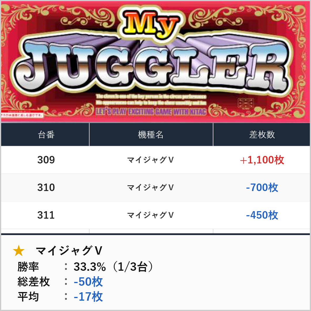 3台並び:マイジャグⅤ(309-311番台)【平均-17枚】