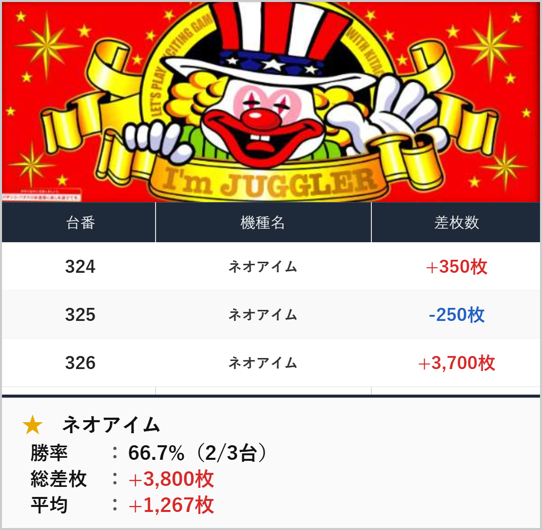 3台並び:ネオアイム(324-326番台)【平均+1,267枚】