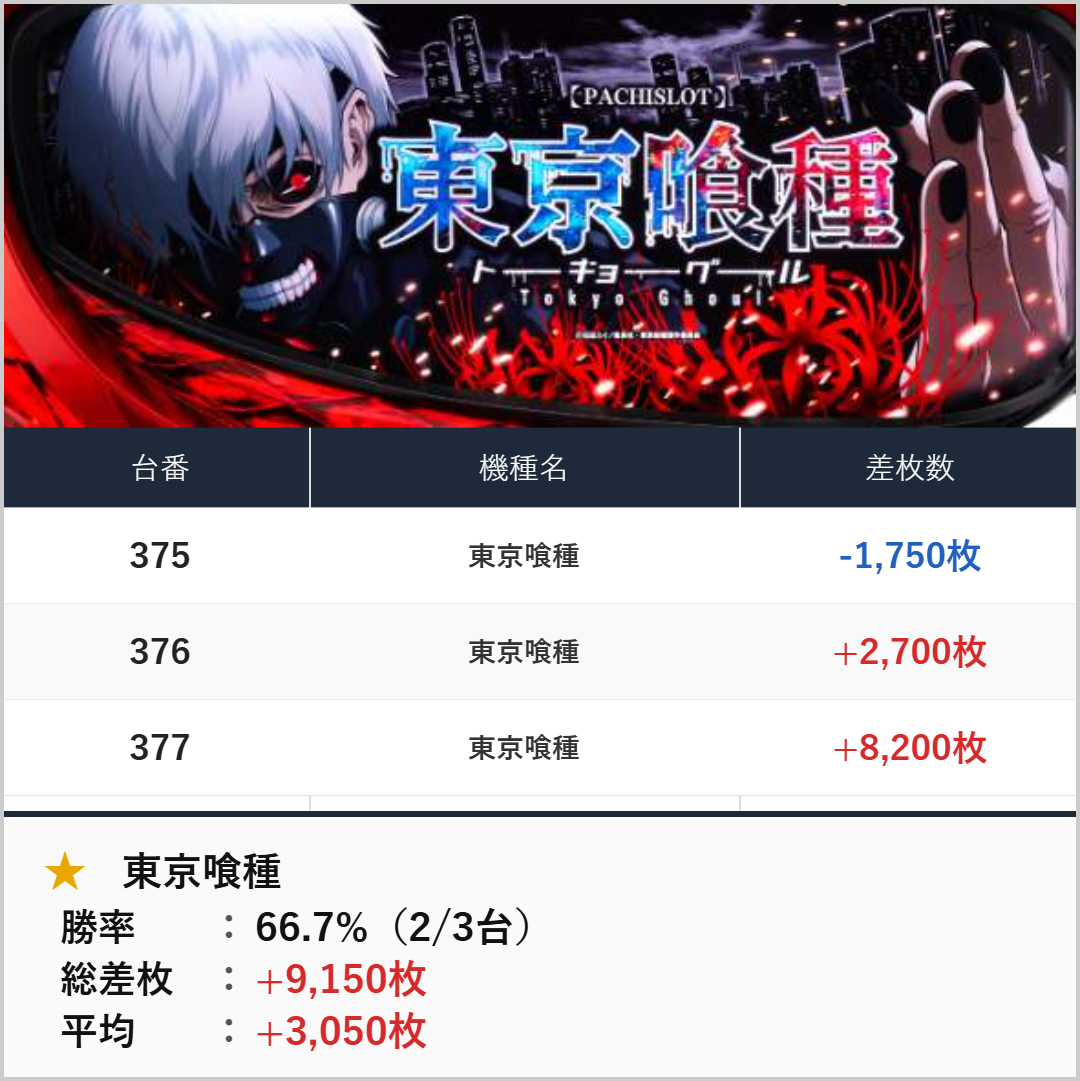 3台並び:東京喰種(375-377番台)【平均+3,050枚】