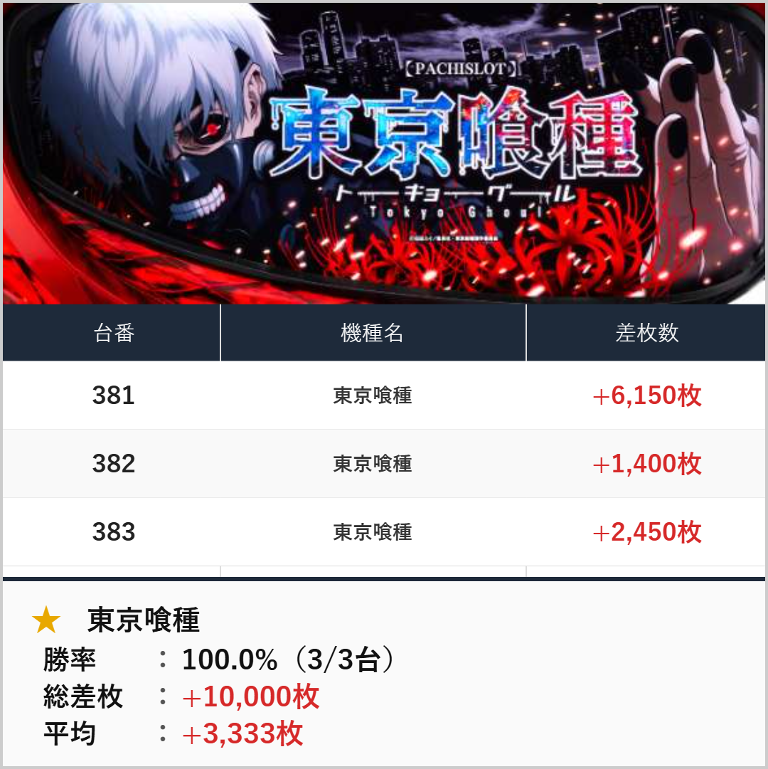 3台並び:東京喰種(381-383番台)【平均+3,333枚】