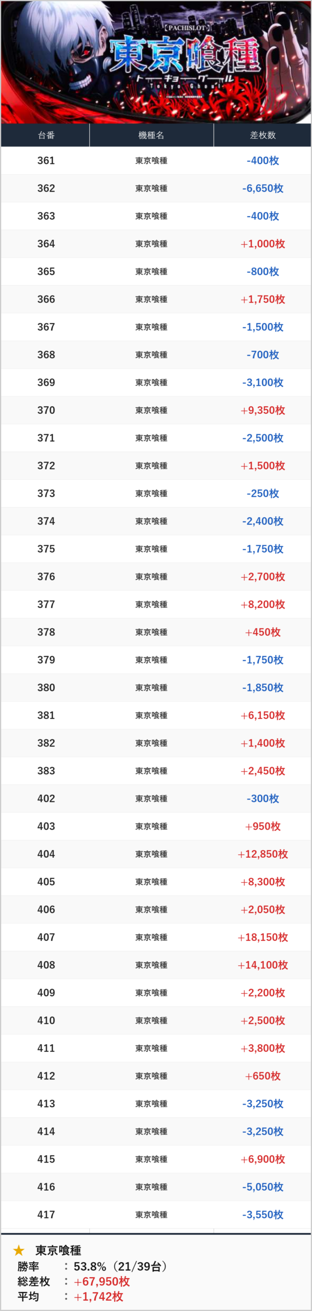 ランキングではコンプリート含め、万枚突破が5台。東京喰種は複数食い込む結果に!