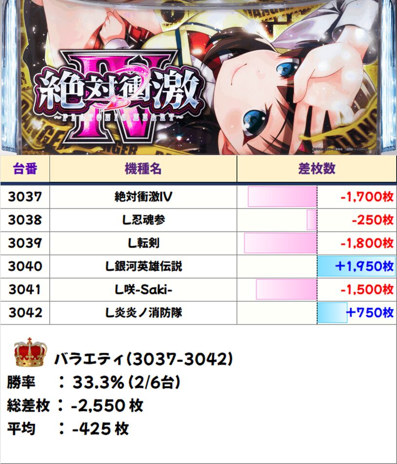 6台並び❷:バラエティ(3037-3042番台)【平均-425枚】