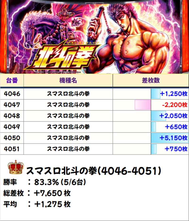 6台並び❸:スマスロ北斗(4046-4051番台)【平均+1,275枚】