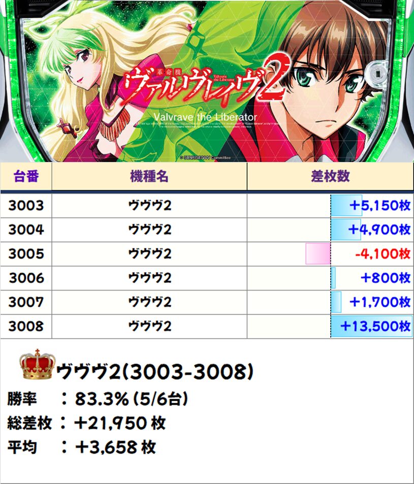 6台並び❶:ヴァルヴレイヴ2(3003-3008番台)【平均+3,658枚】