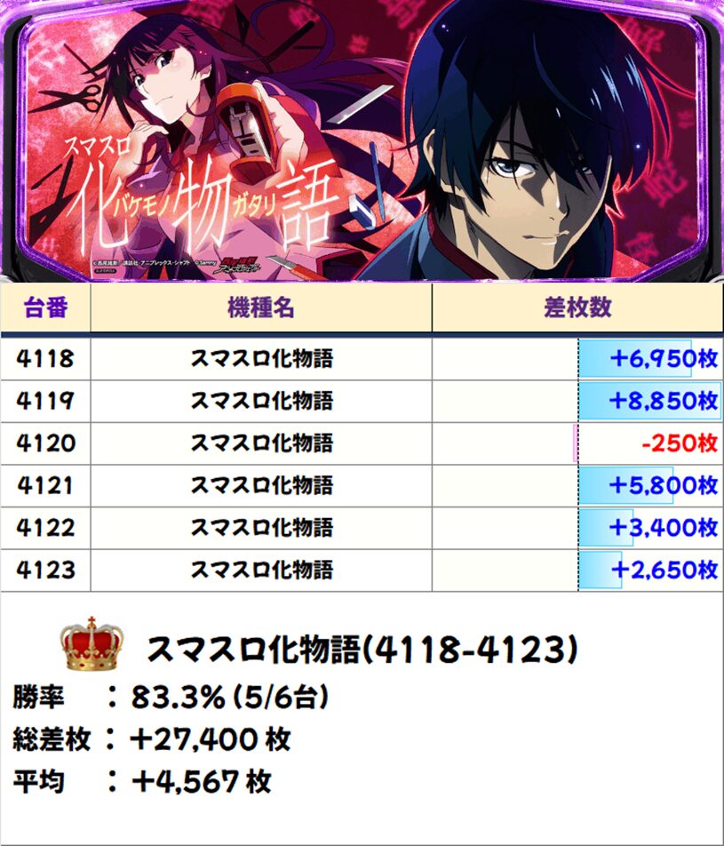 6台並び➍:スマスロ化物語(4118-4123番台)【平均+4,567枚】