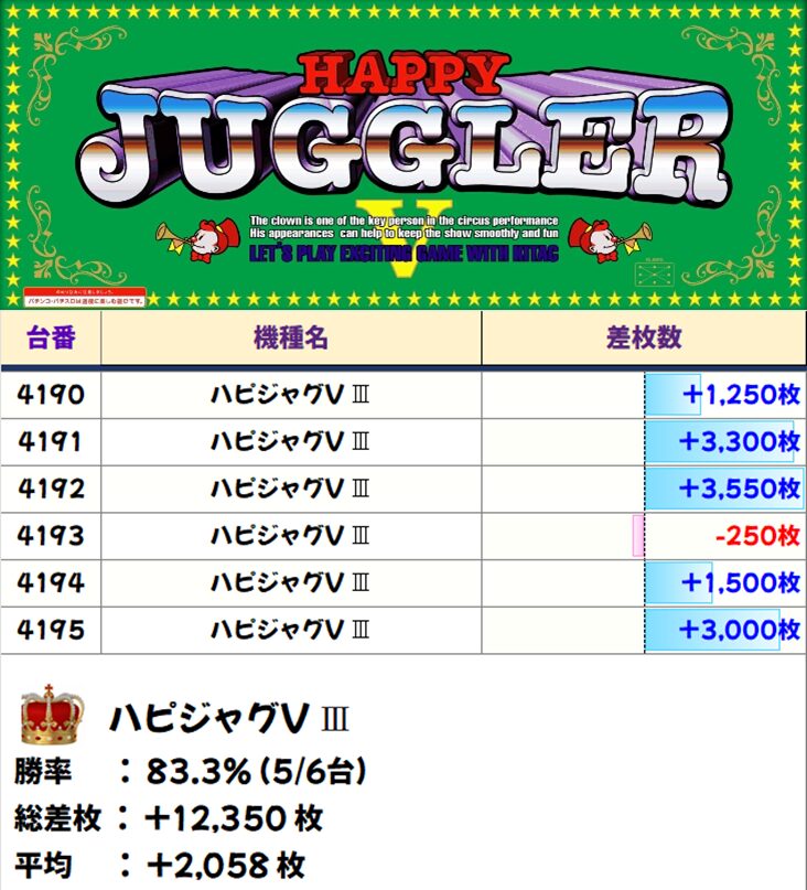 6台中5台がプラスとなり、平均も+3658枚の安定かつ好結果に!3008番台は万枚overでした!