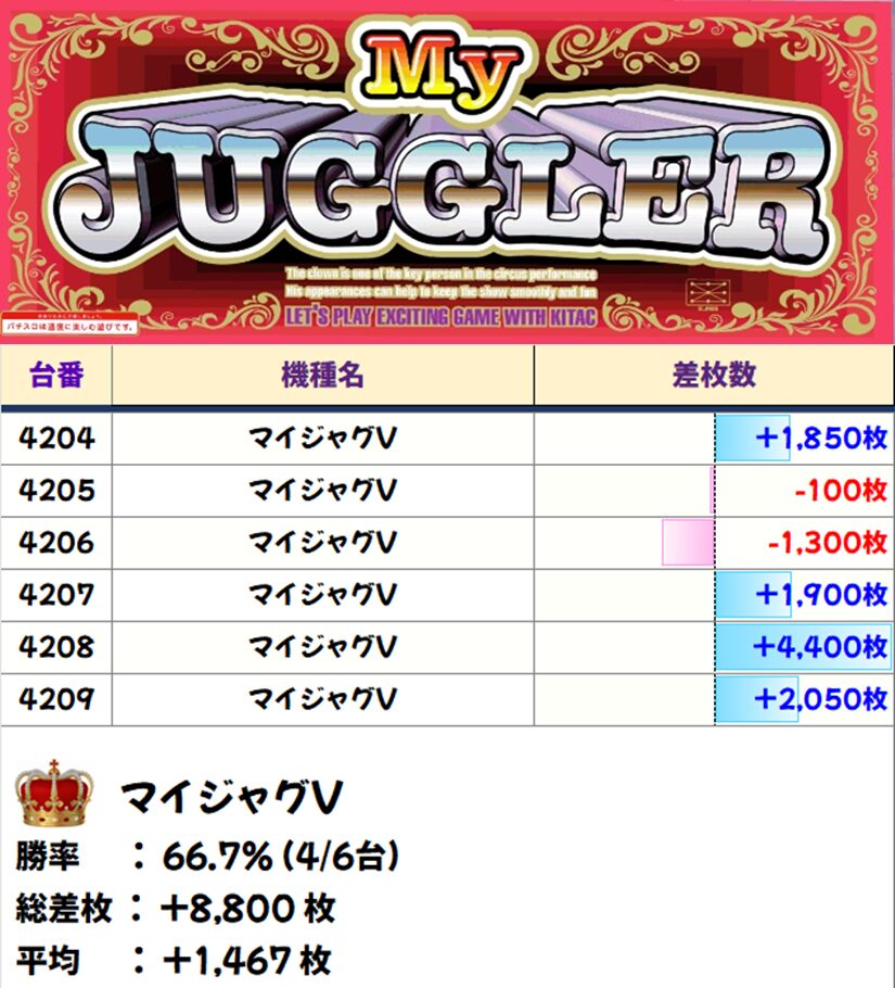 惜しくも1台マイナスでしたが、平均差枚+4,567枚とかなりの好結果となっていました!
