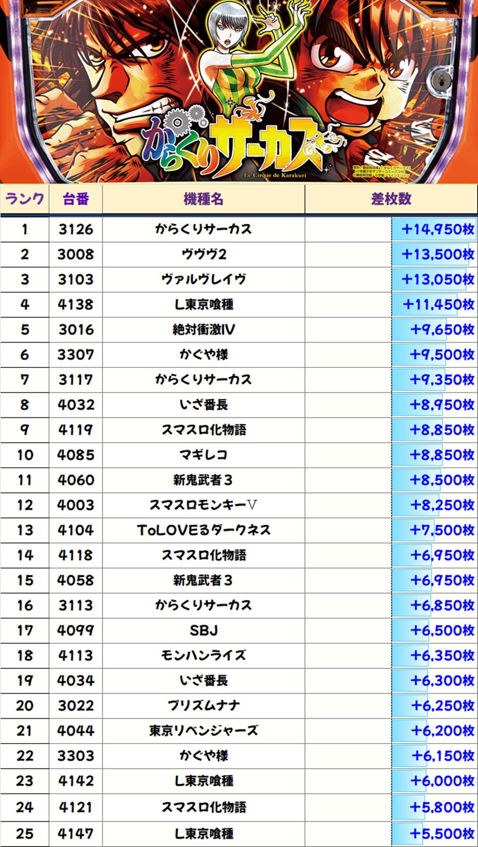 TOP25は全て+5000枚オーバーと質の高い優秀台を多数確認!今回は万枚オーバー台が4台出現!