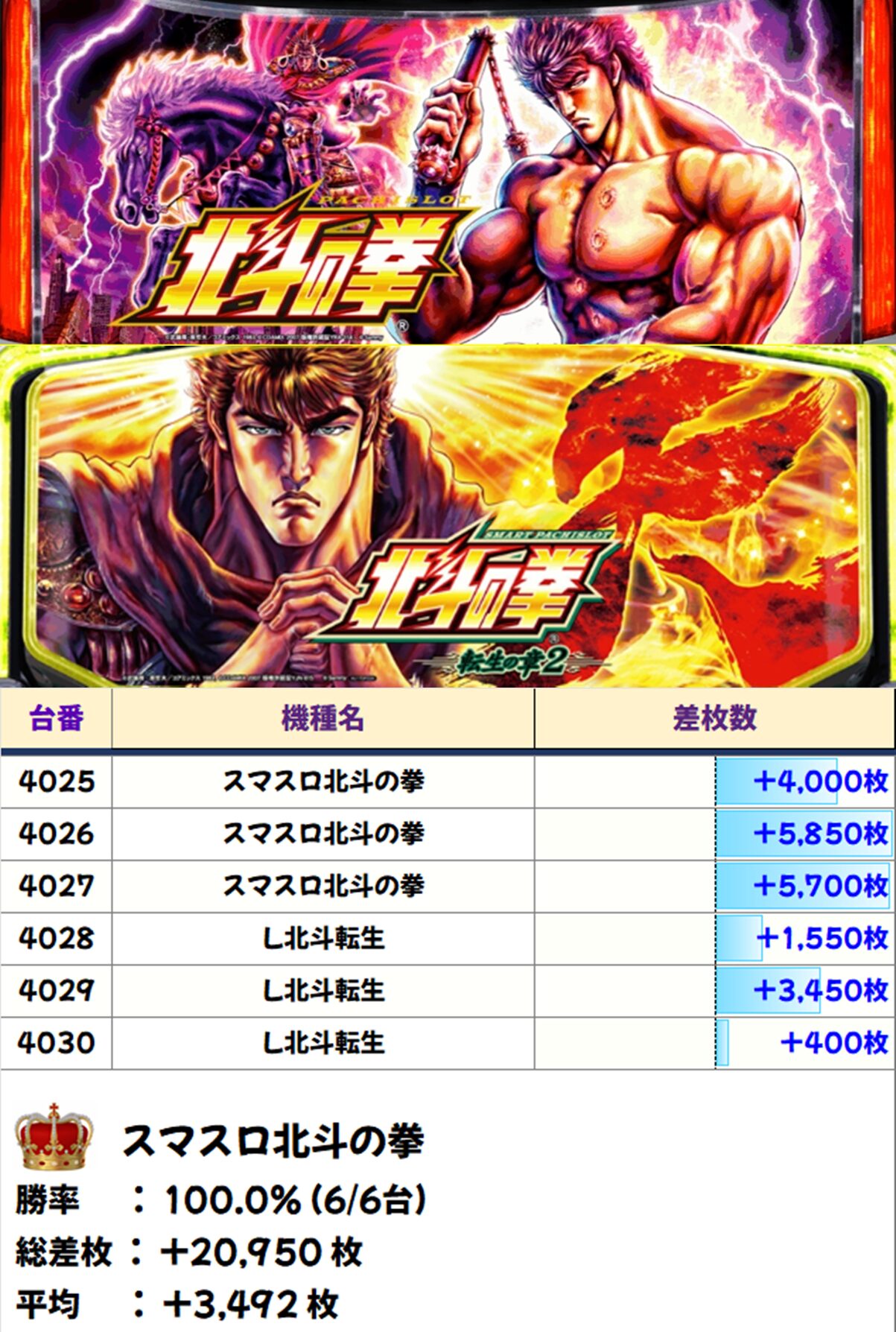 6台並び❸:スマスロ北斗&北斗転生2(4025-4030番台)【平均+3,492枚】