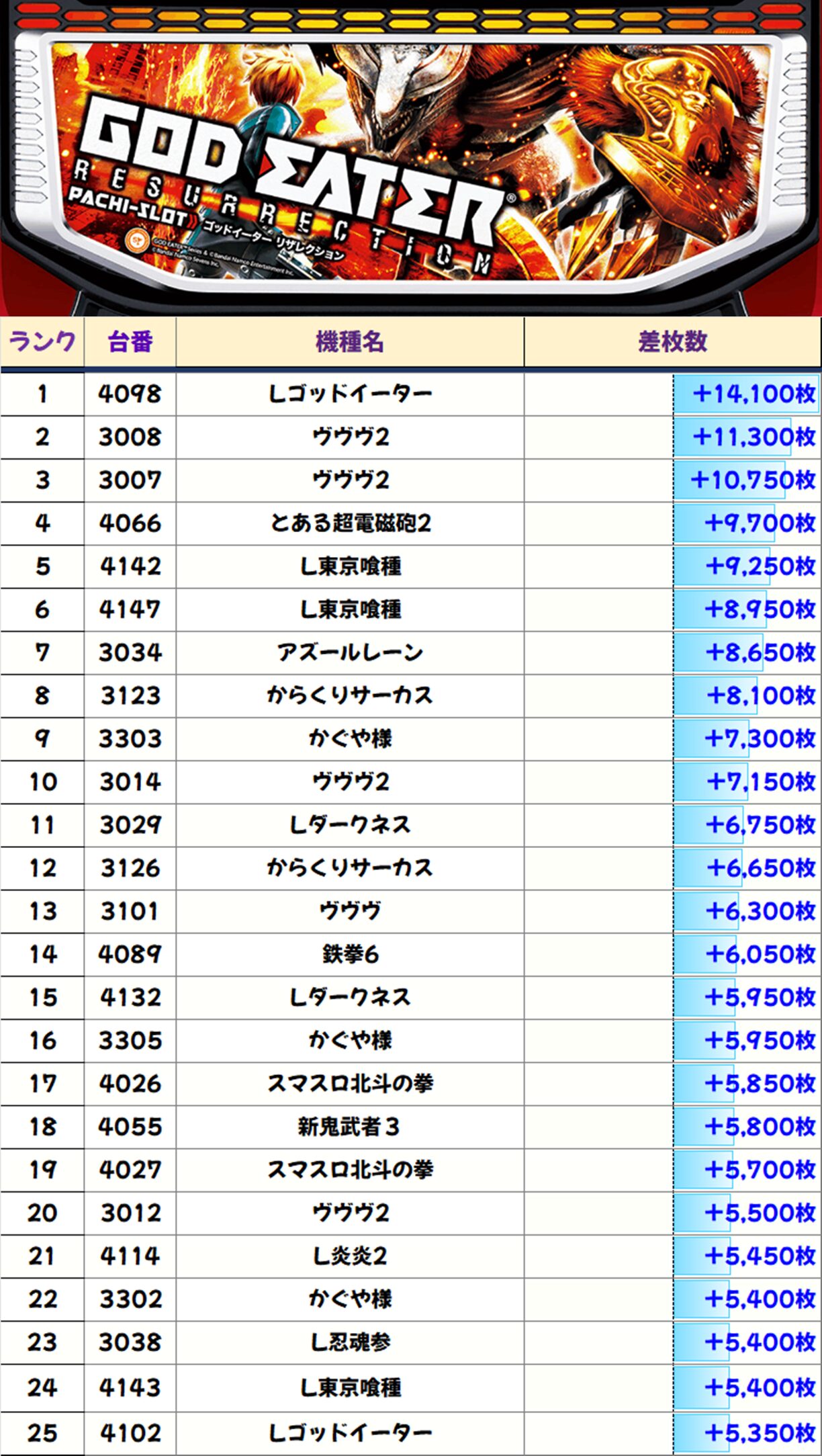 TOP25は全て+5000枚overと質の高い優秀台が多数!万枚オーバー台が3台出現!
