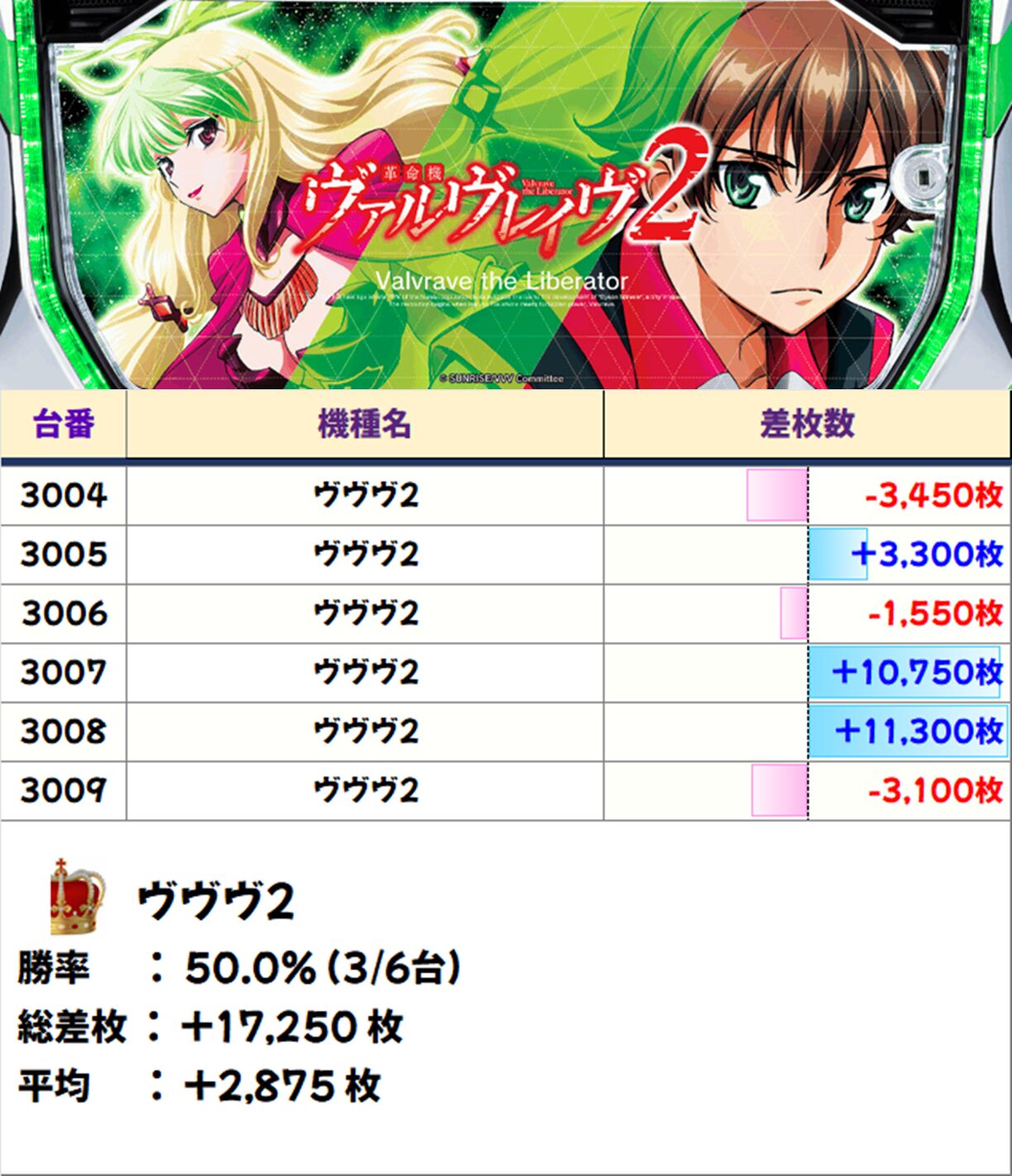 6台並び❶:ヴァルヴレイヴ2(3004-3009番台)【平均+2,875枚】