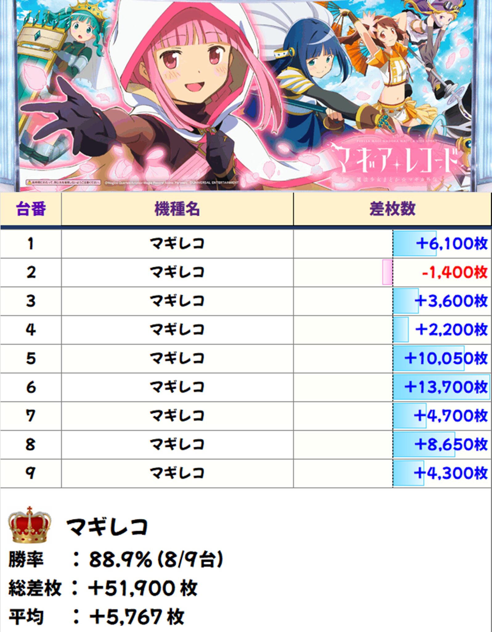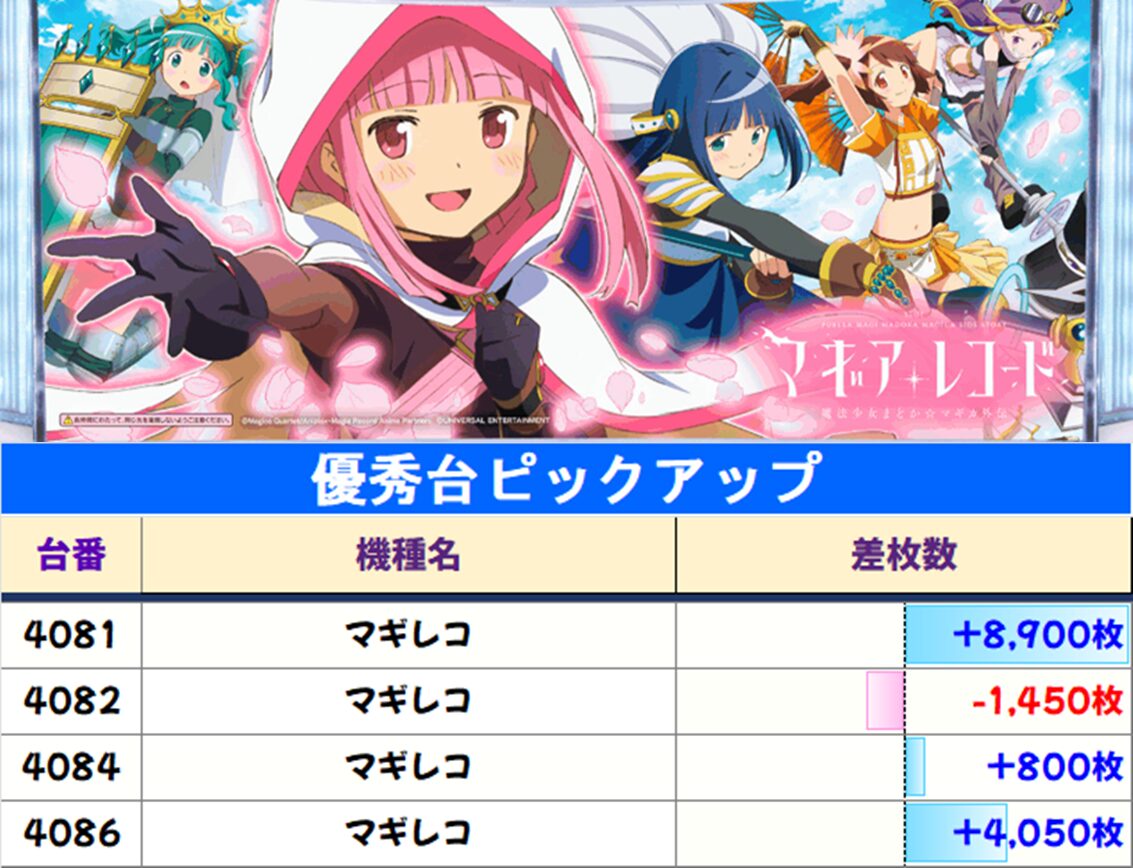 【マギレコ】が勝率89%・万枚over2台・機種平均+5,767枚と超好結果!