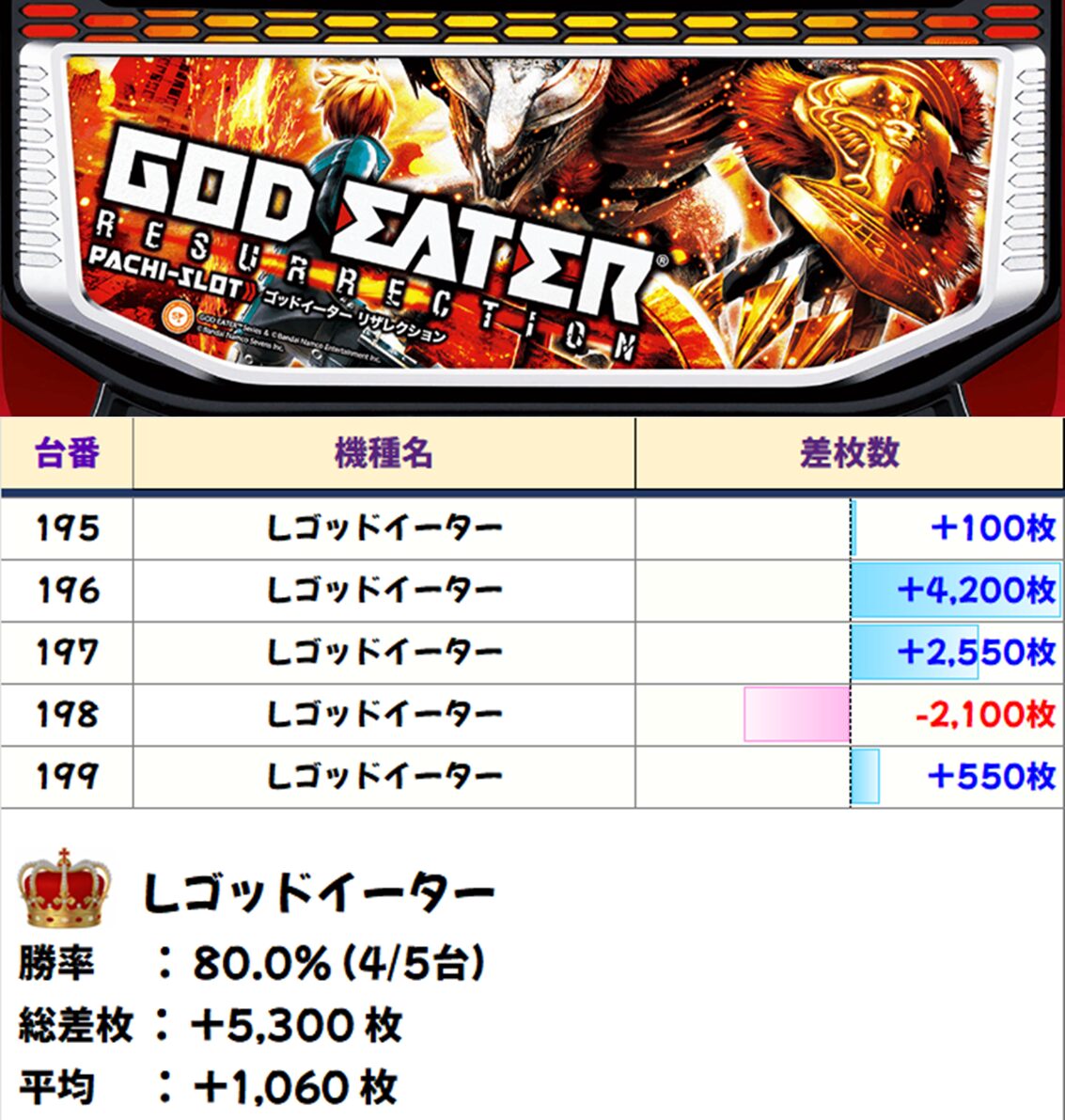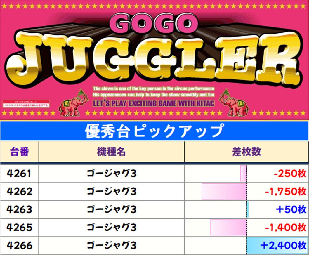 スロット平均差枚+267枚・プラス台は186台(勝率42.7%)と全体でも好結果に!
