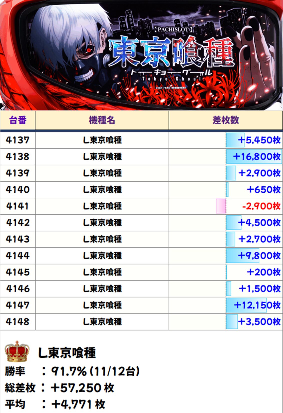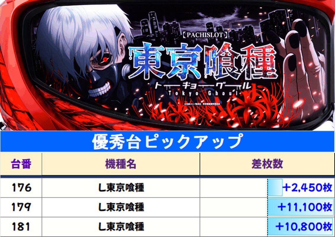 さらに【東京喰種】も12台中11台プラス・平均+4,771枚と両機種ともに素晴らしい出玉でした!