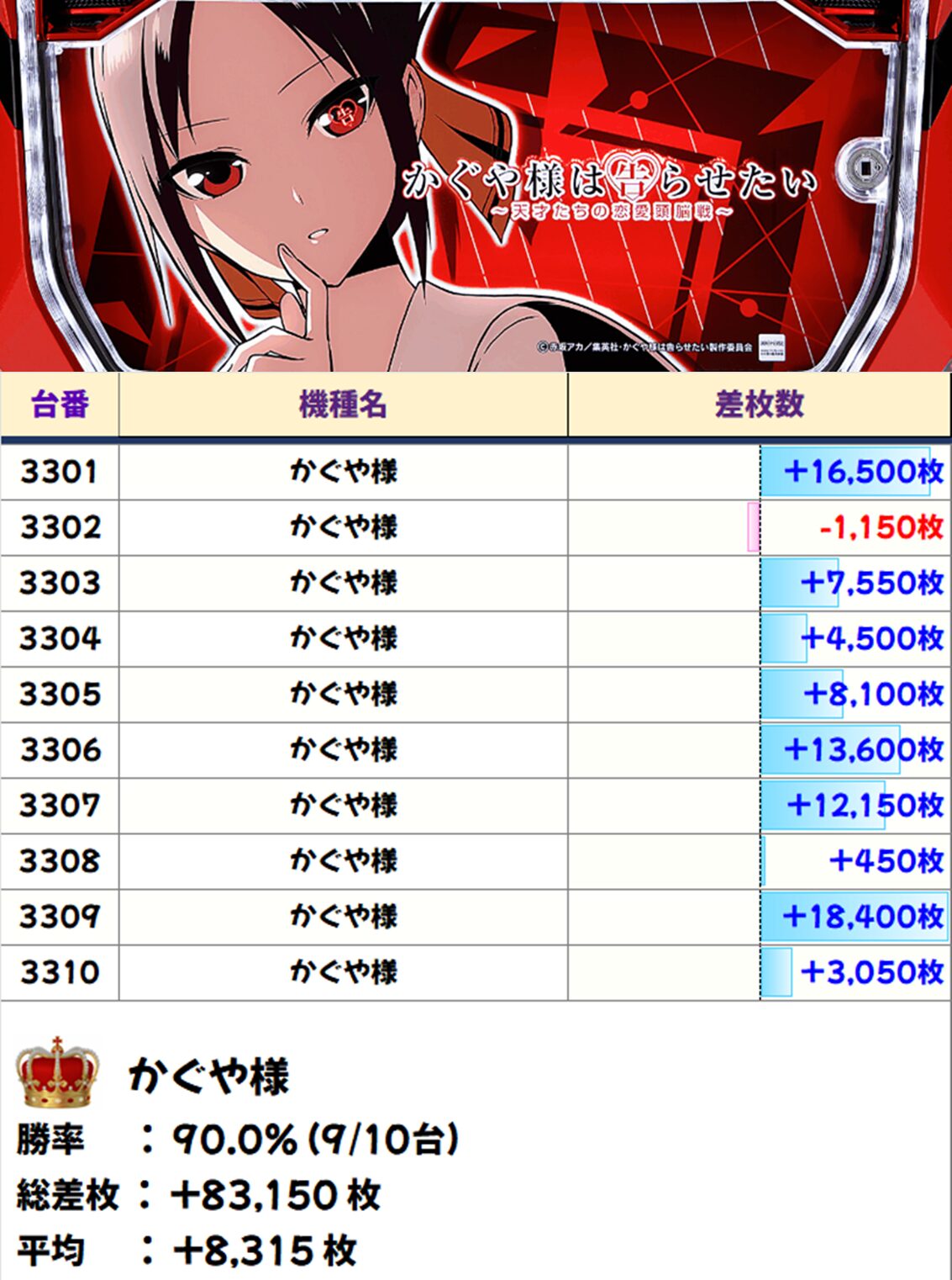 全台🌈は前回同様【かぐや様】10台中9台プラス・平均+8.315枚と超大爆発の結果!