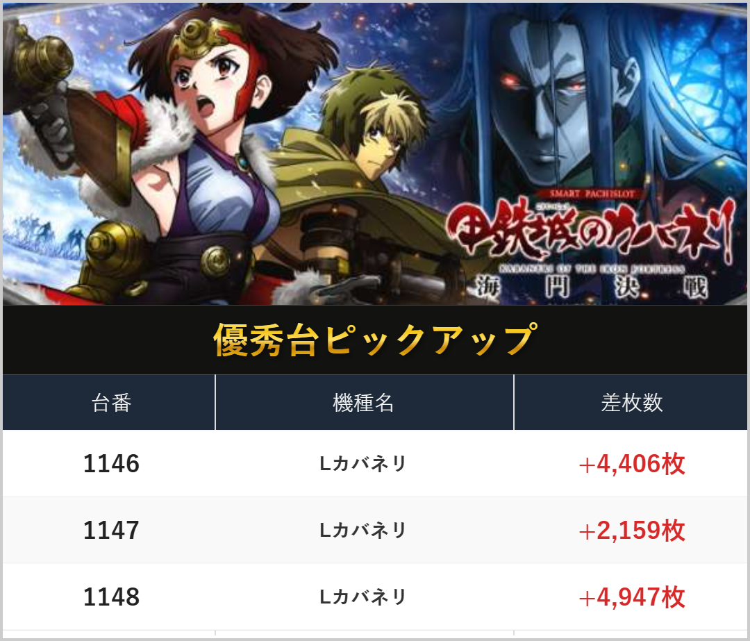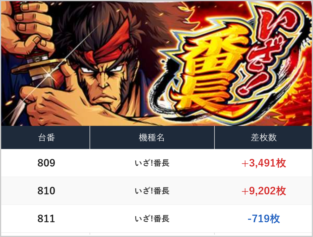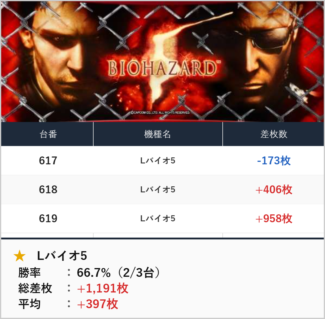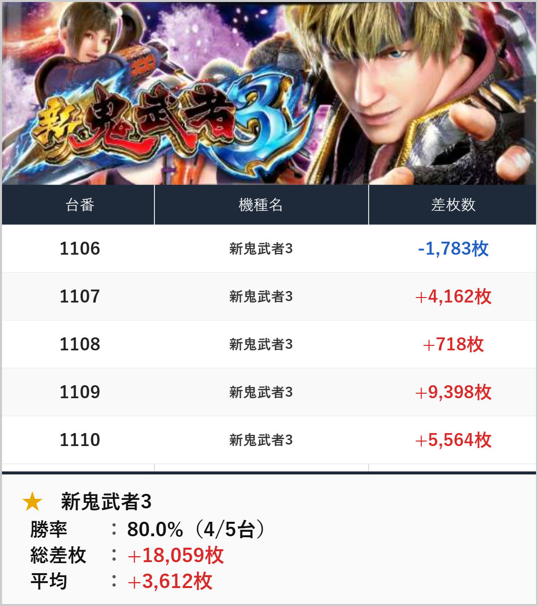 新鬼武者3は5台中4台プラス(勝率80%)の平均+3,612枚と超好結果。
