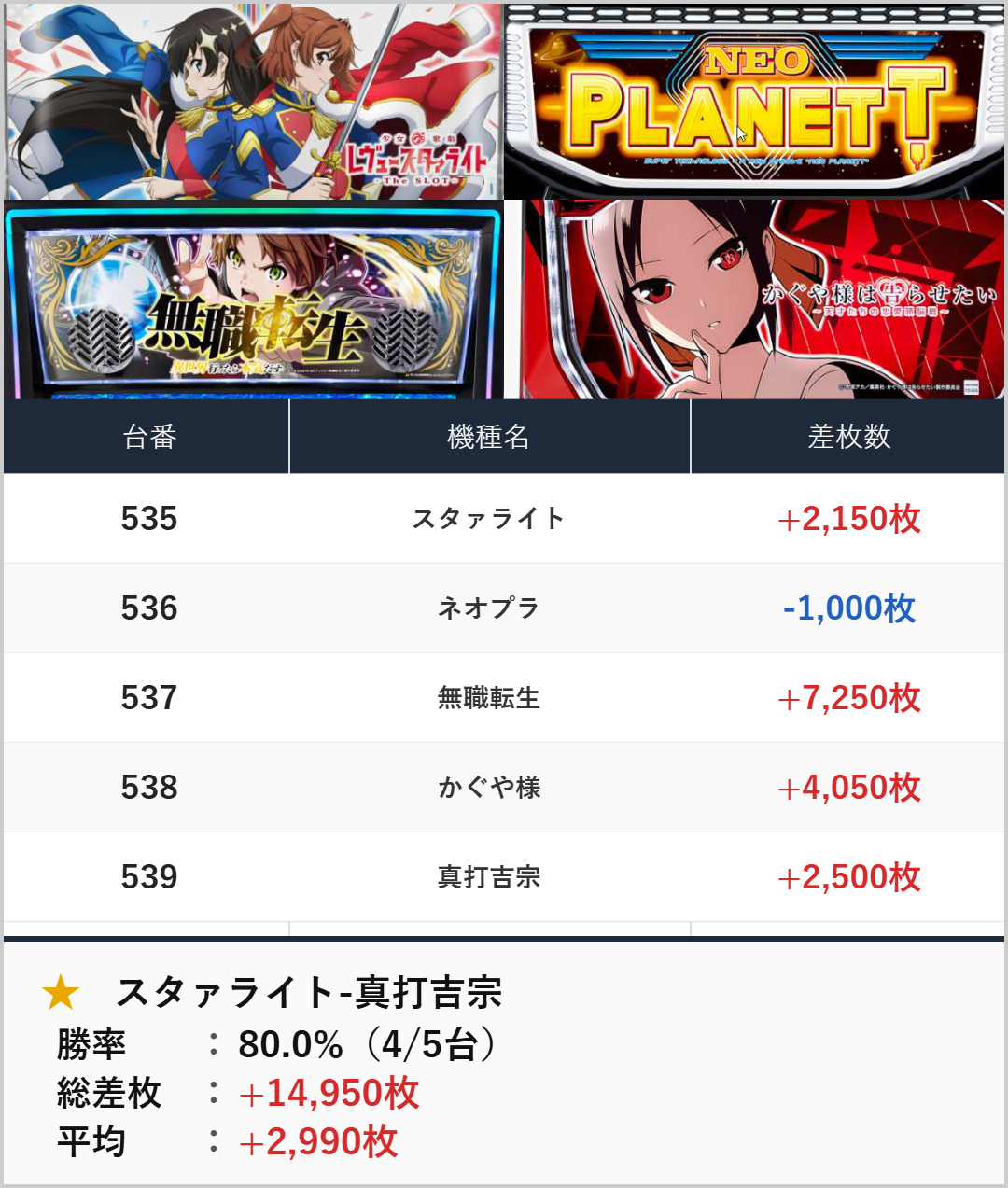 4台並び:スタァライト-真打吉宗(535-539番台)【平均+2,990枚】