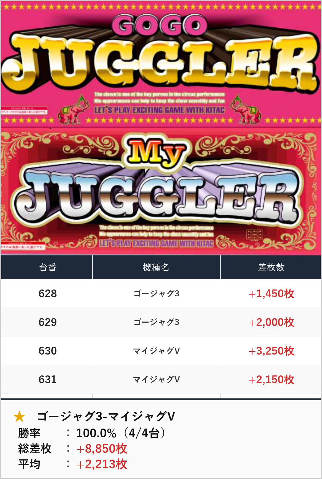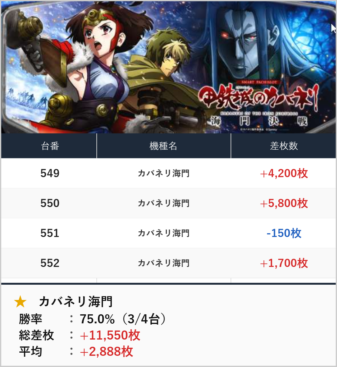 勝率75%・平均2,969枚と好結果。