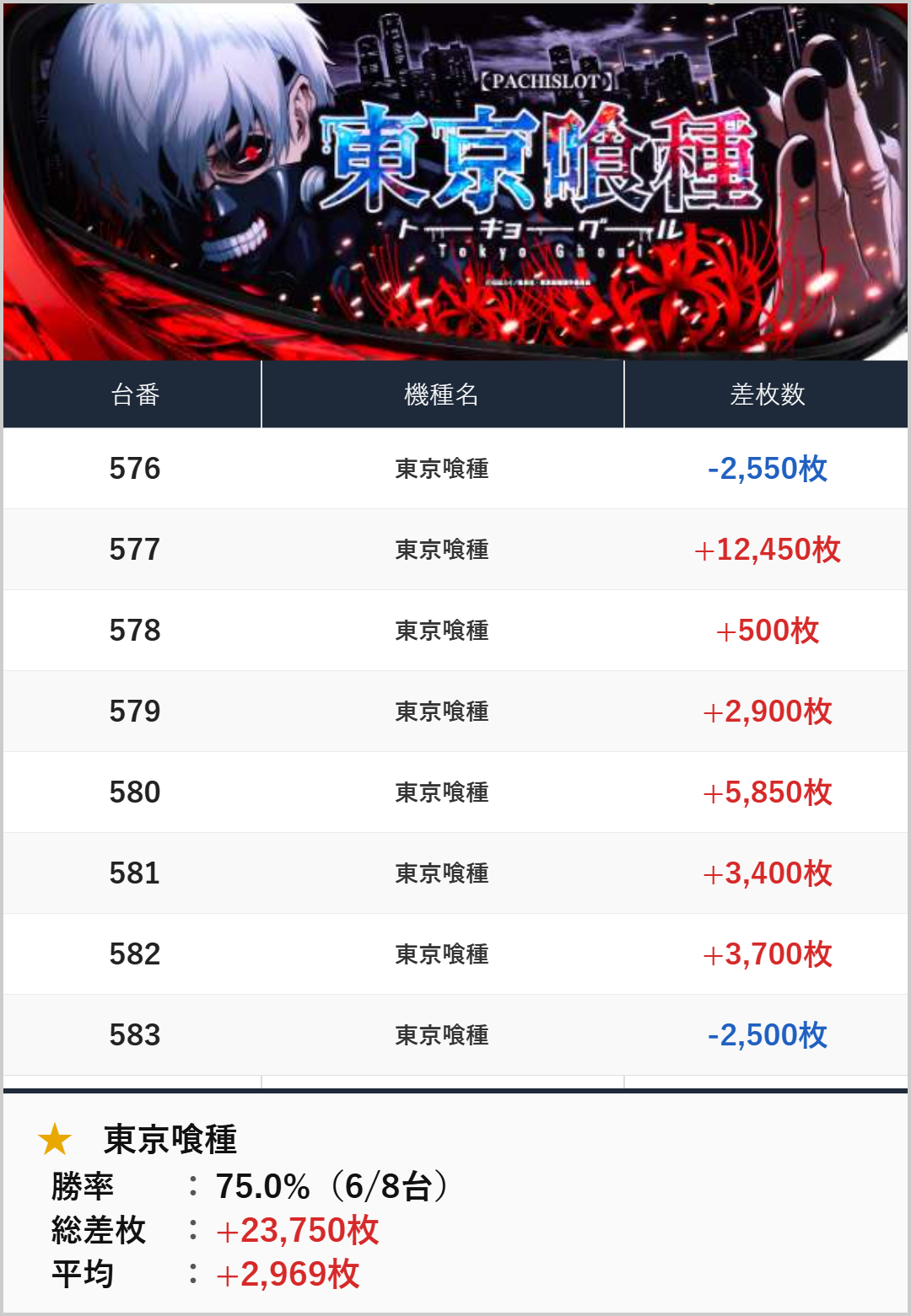 並び+全台系:東京喰種(576-583番台)【平均+2,969枚】