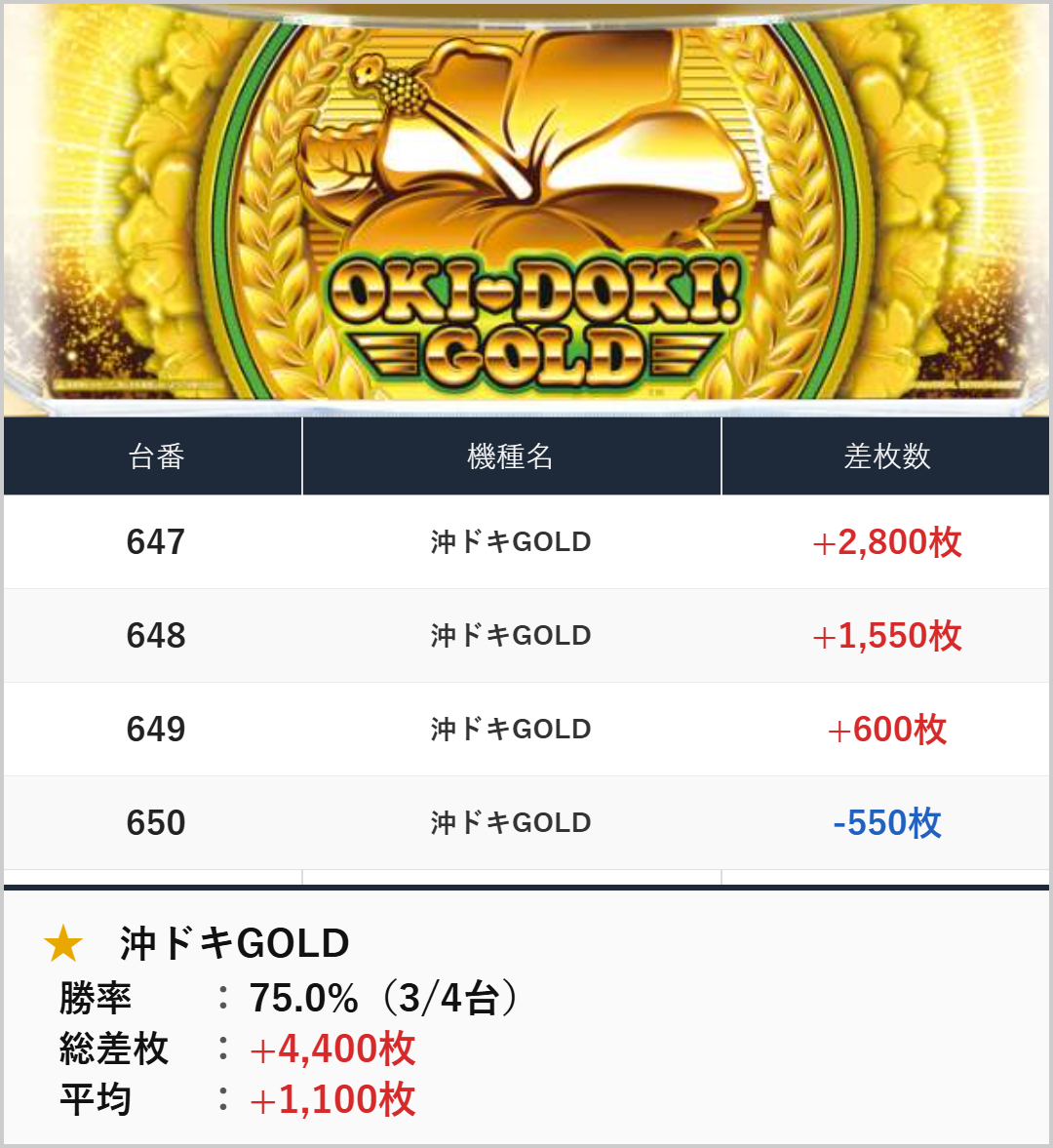 4台並び:沖ドキGOLD(647-650番台)【平均+1,100枚】