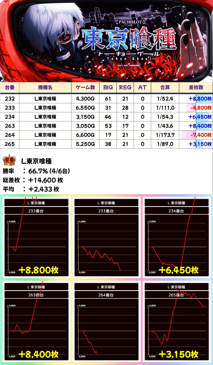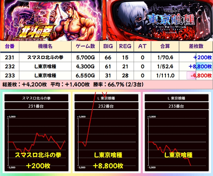 また、島マタギの並びも確認でき、「スマスロ北斗」と「東京喰種」の231番台~233番台が島マタギの並びとなっていました。