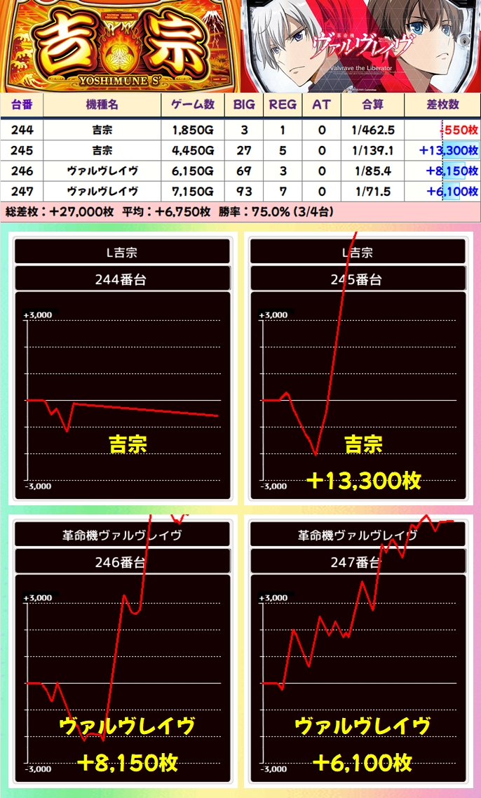 この日は推し機種の「東京喰種」に加え、仕掛け常連機種の「ヴァルヴレイヴ」などが1/2系濃厚の結果になっており、新たにハイスペックスマスロとなった「吉宗」も仕掛けの対象に!