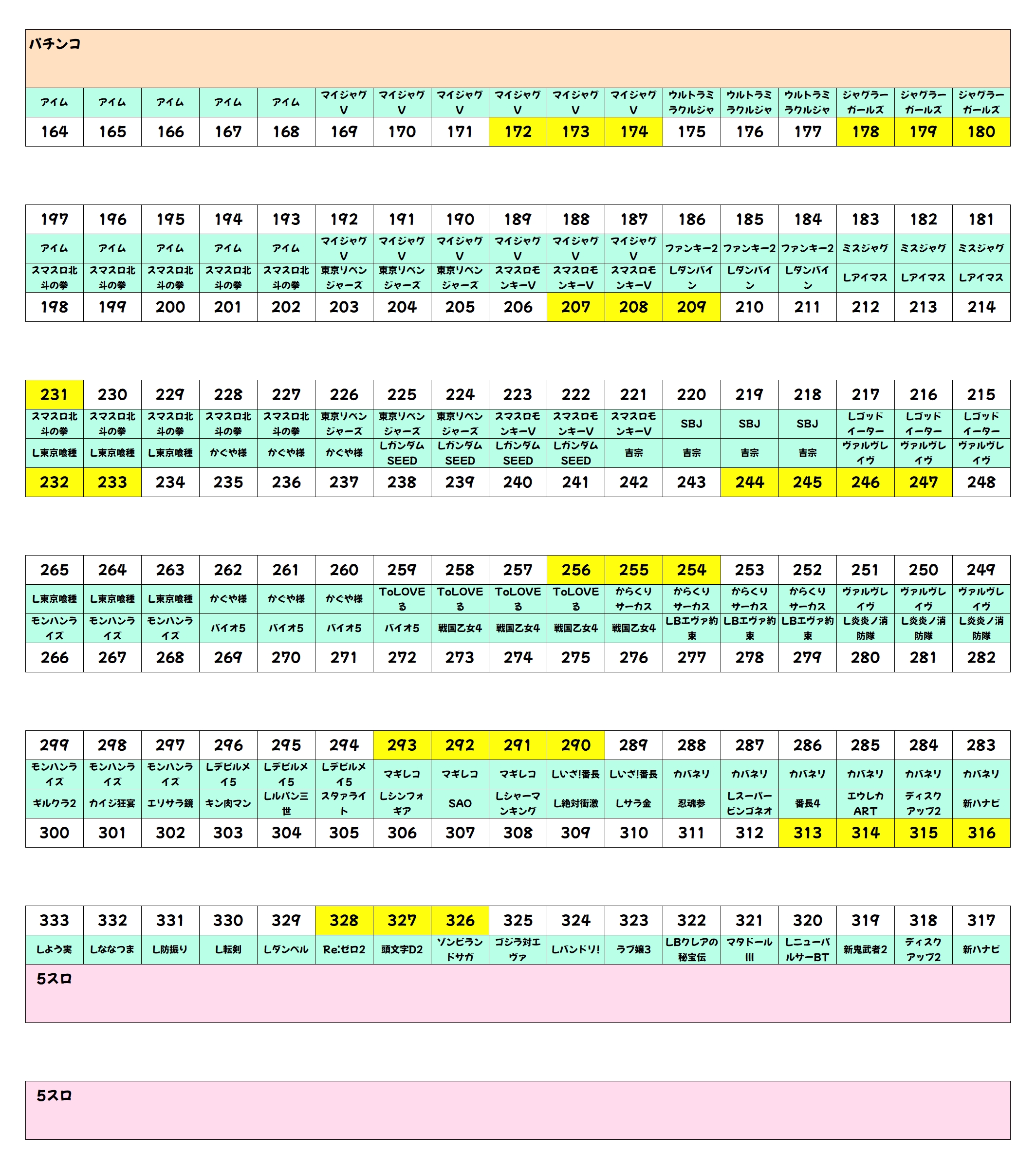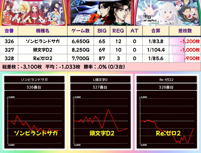バラエティの並びに関しては、冒頭で触れた通り2箇所とも大都機種を絡めた形となっており、326番台~328番台の並びは大都機種の「ゾンサガ」と「Re:ゼロ2」で挟む形に!