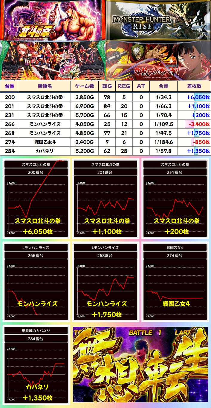 また、定番機種は「モンキーターン」「スマスロ北斗」「モンハンライズ」「戦国乙女」「カバネリ」の5機種となっており、狙い目機種だった「モンキーターン」以外の機種もしっかり単品が投入されていました。