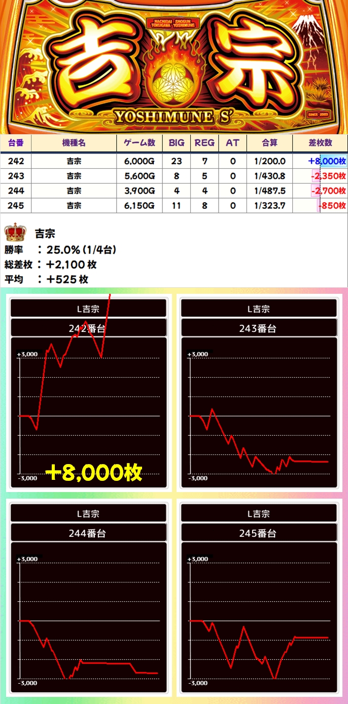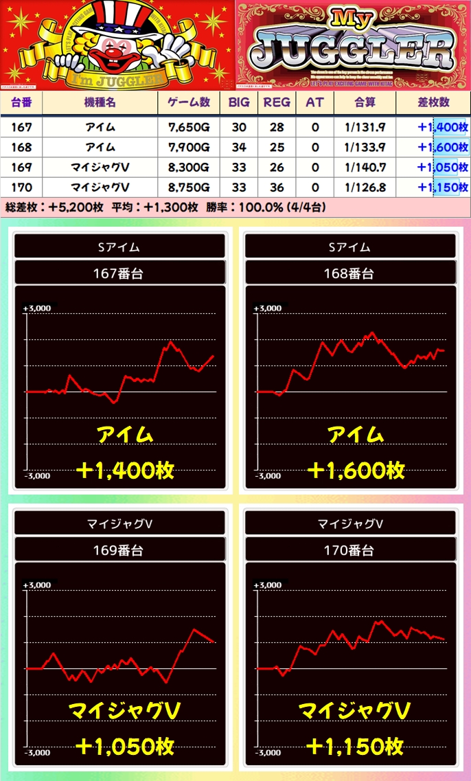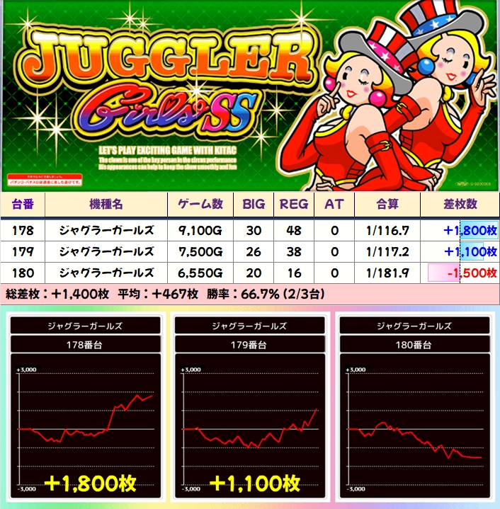 また、ジャグラーシリーズにも全台系が用意されていたようで、3台設置の「ジャグラーガールズ」が全台系濃厚の結果となっていました。