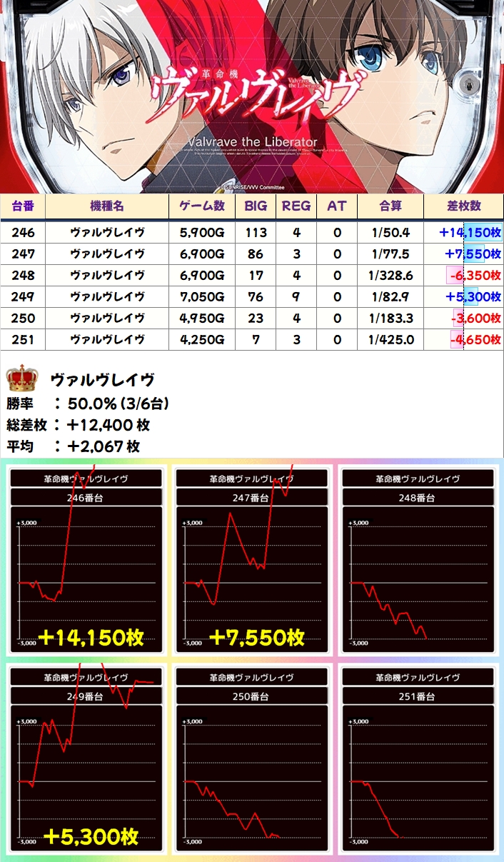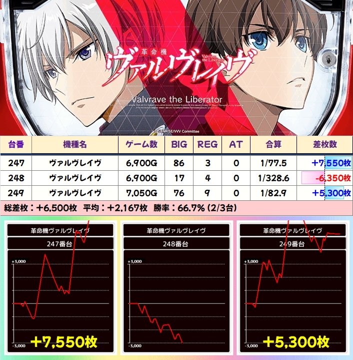 また、仕掛け常連機種の「ヴァルヴレイヴ」には様々な設定が使われていたようで、+5000枚以上の爆出し台が複数出現していました。