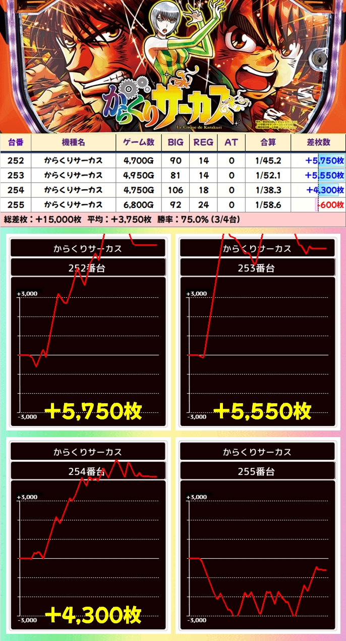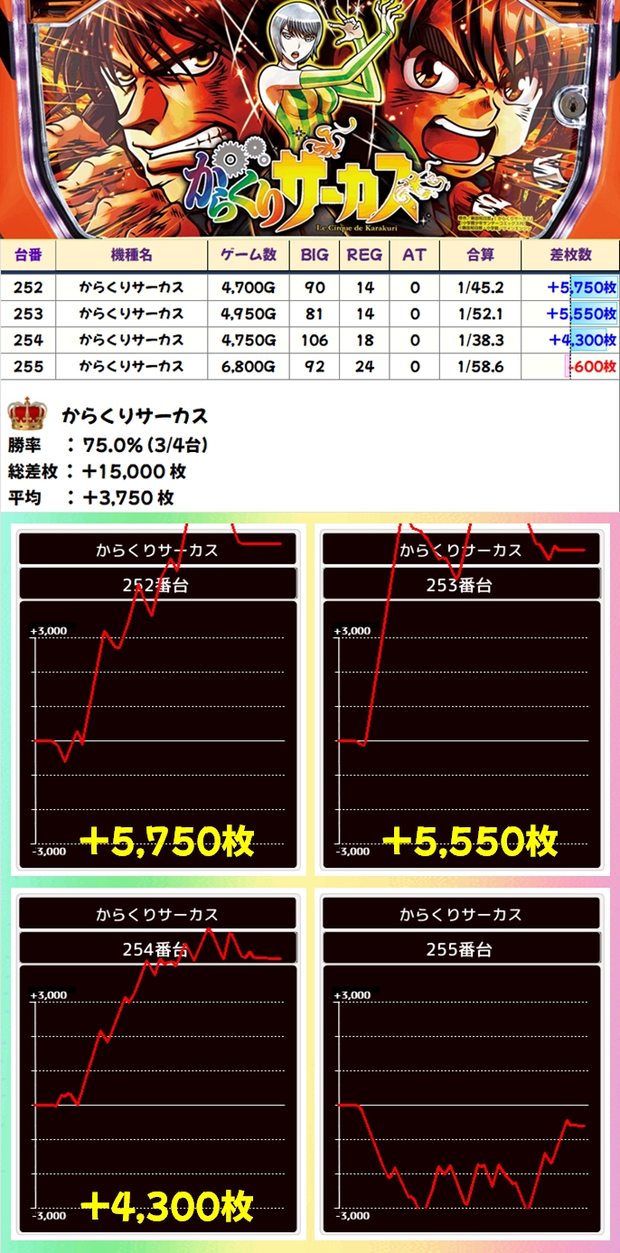 この日はハイスペックスマスロの大半が仕掛けの対象になっており、4台設置の「からくりサーカス」は全台系濃厚の結果に!