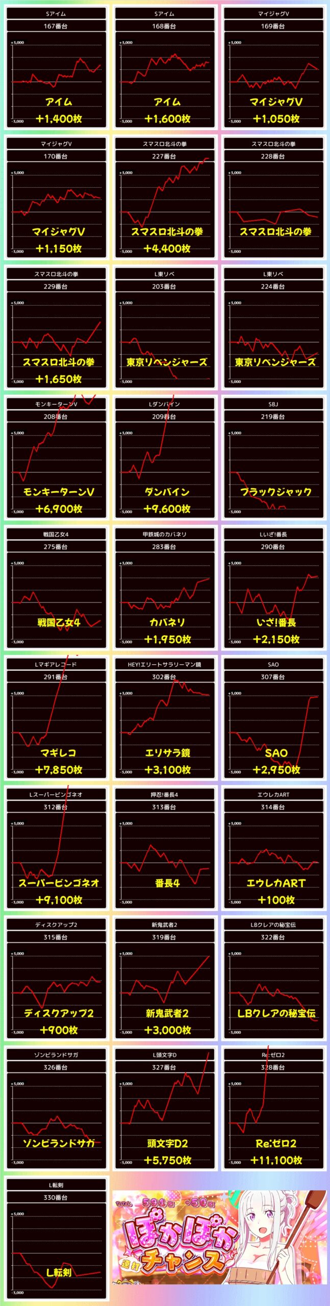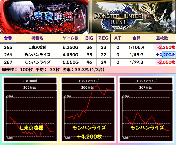 恒例となっている機種マタギ・島マタギの並びも用意されており、今回は「ヴァルヴレイヴ」の247番台~249番台と、「モンハンライズ」と「東京喰種」の265番台~267番台が島マタギの並びとなっていました。