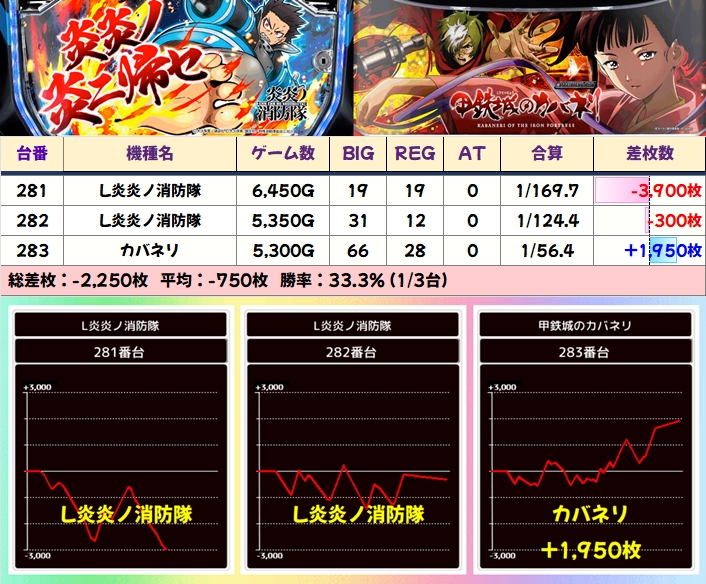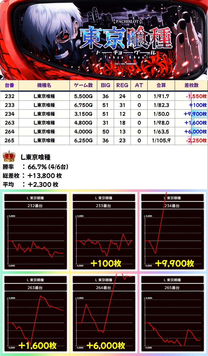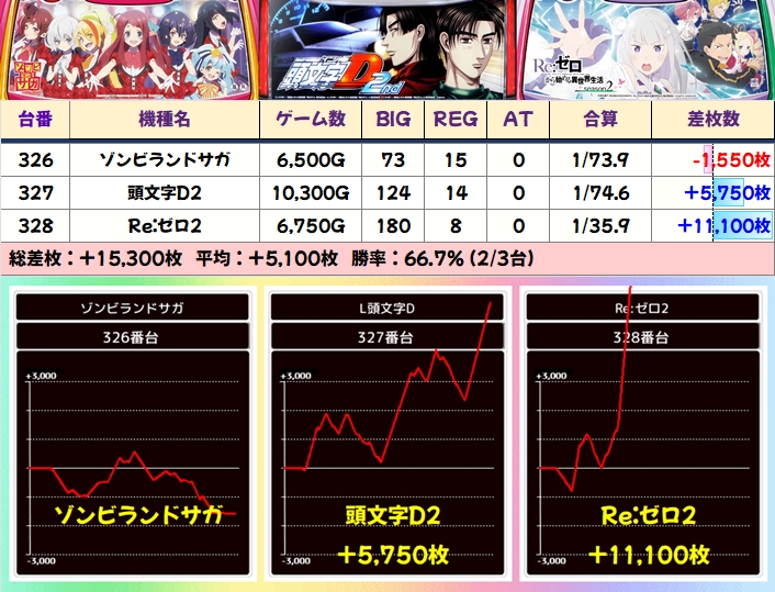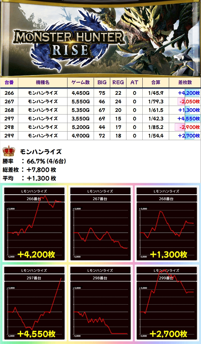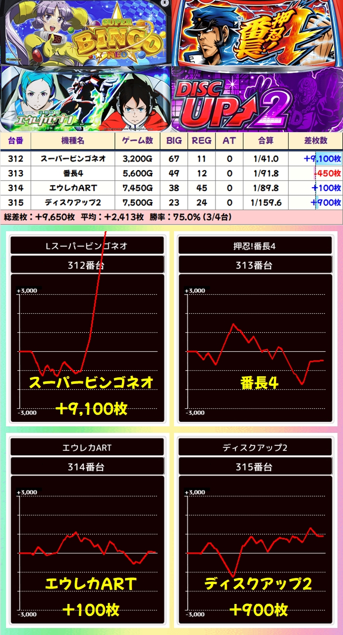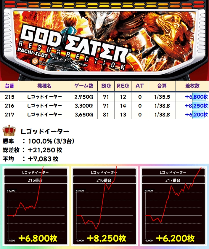 この日は狙い目のハイスペックスマスロ以外からも仕掛けを複数確認でき、全台系濃厚の「ゴッドイーター」は平均+7000枚オーバーとド派手な結果に!