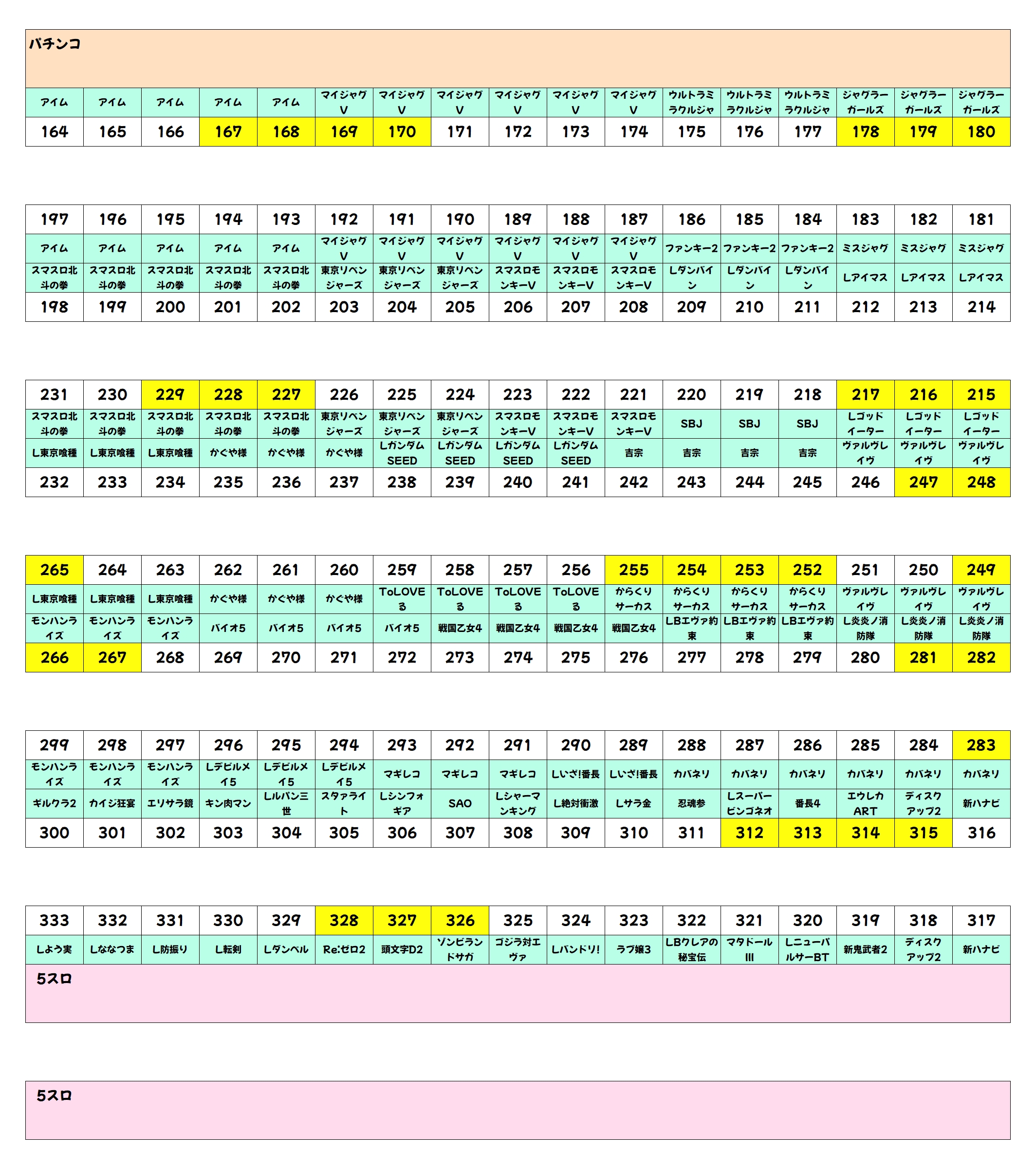 また、バラエティは大都機種を絡める形となっており、326番台~328番台は大都機種で挟んだ並びに。