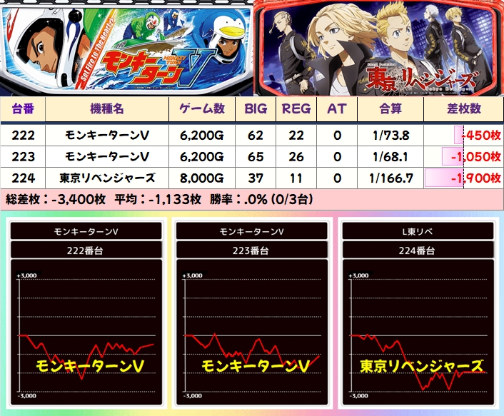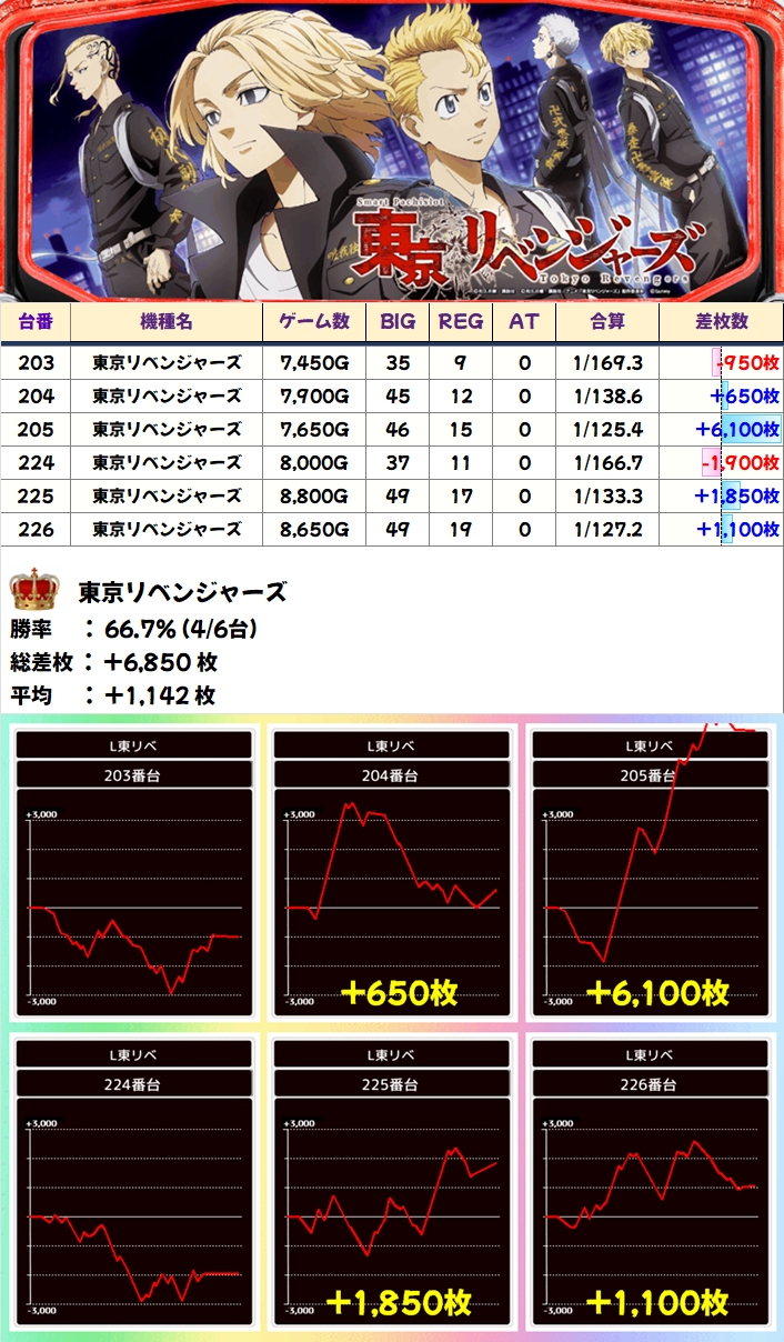 さらに、準新台の「東京リベンジャーズ」も1/2系濃厚で、こちらは+6000枚以上の大量出玉が飛び出していました。