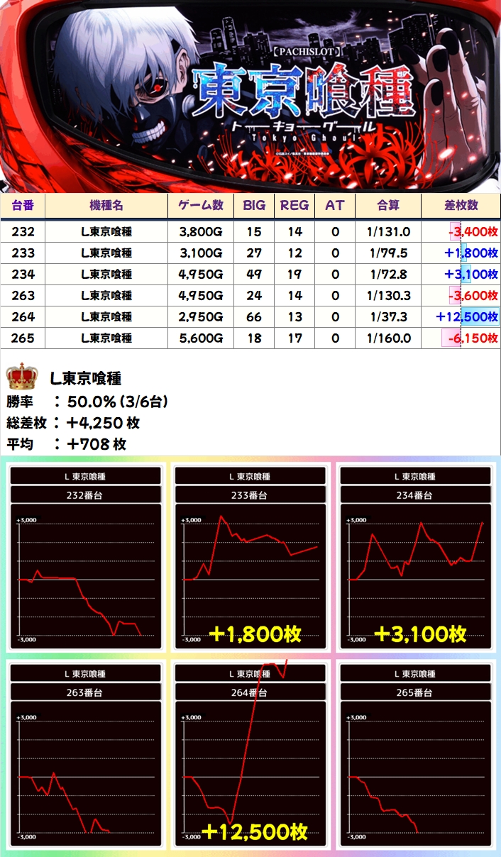 「東京喰種」からは爆出し台を確認でき、264番台が万枚オーバーの出玉を叩き出していました!