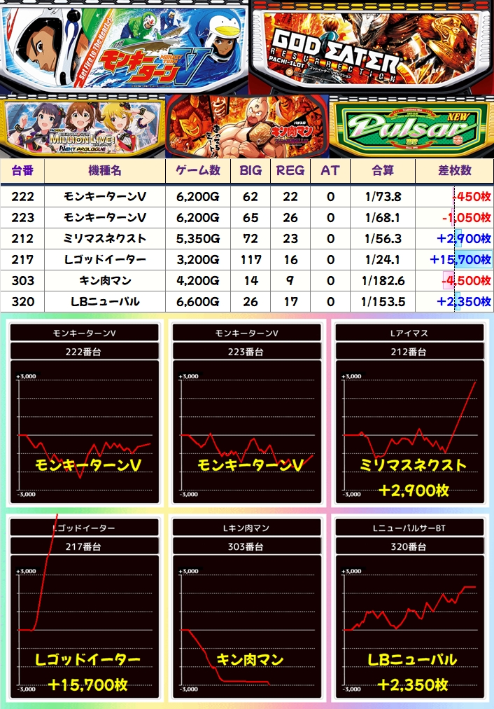 さらに山佐機種からは単品も確認でき、「ゴッドイーター」の217番台は+15700枚と圧倒的な一撃を見せていました。